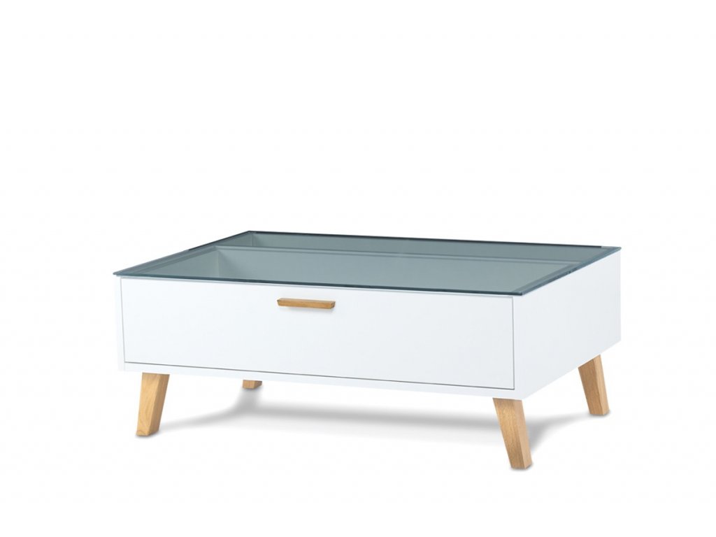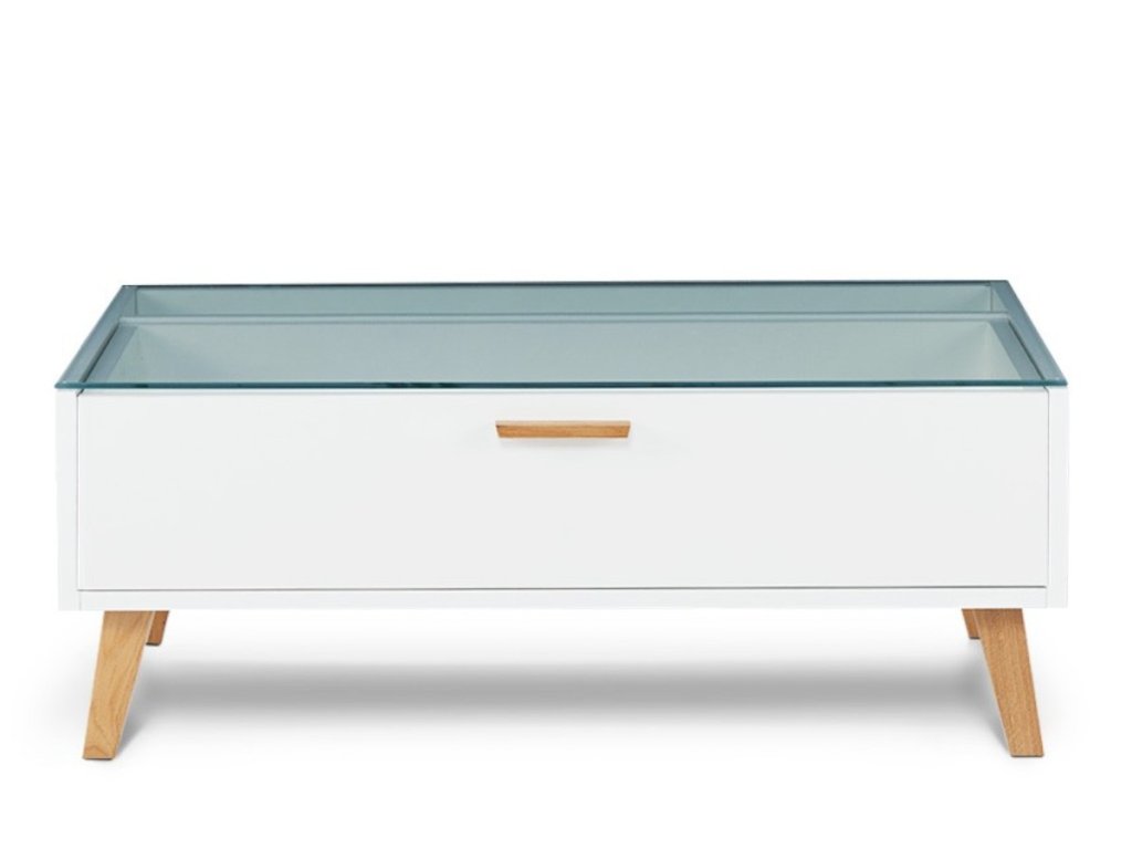 Konferenční stolek v moderním skandinávském designu se skleněnou deskou a zásuvkou v kombinaci bílé a světlého dřeva. Mějte uložené věci pod kontrolou.