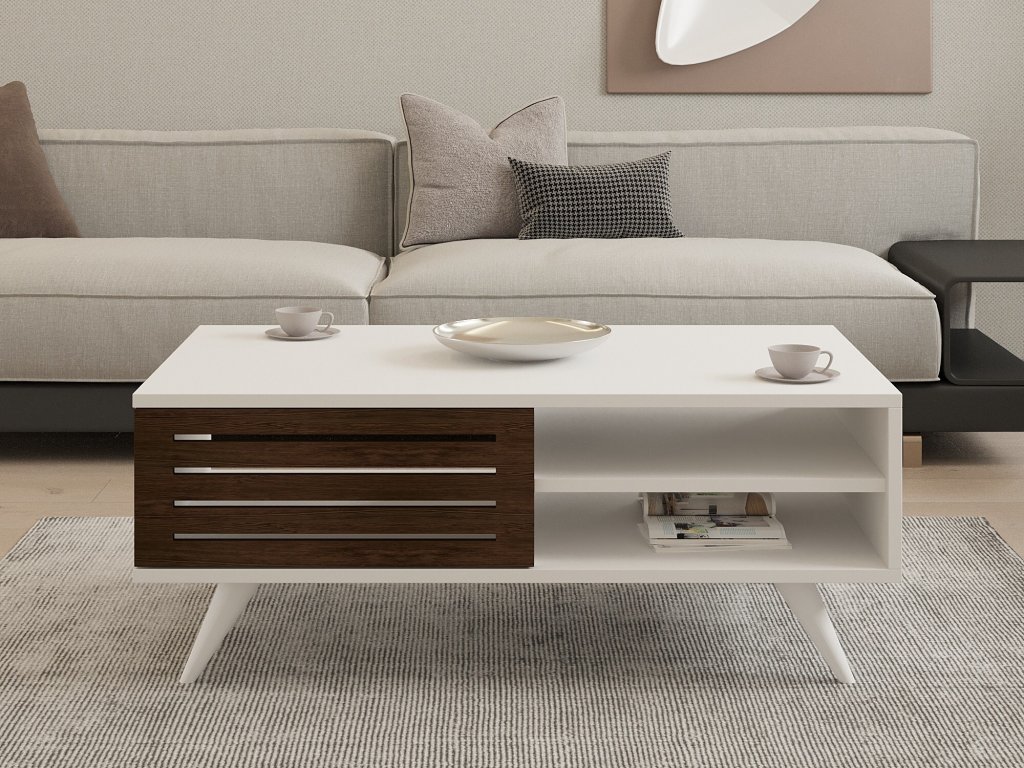 Stolek je víceúčelový a poskytuje nejen plochu pro odkládání věcí, ale i vnitřní úložné prostory.