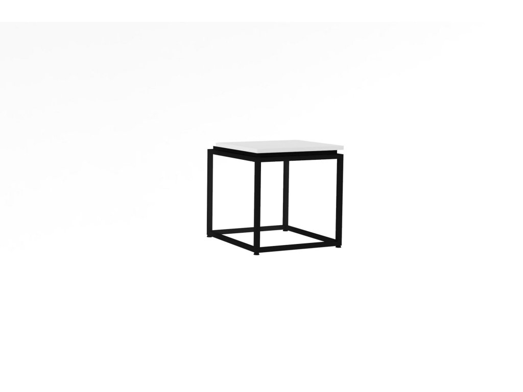 Krychlový konferenční stolek NERGIS nabízí bílou odkládací desku, ukotvenou v černém kovovém rámoví.