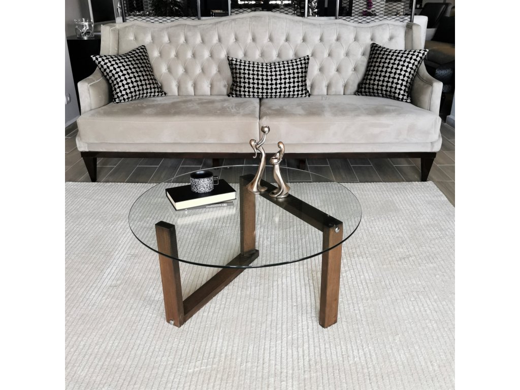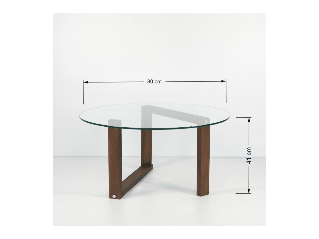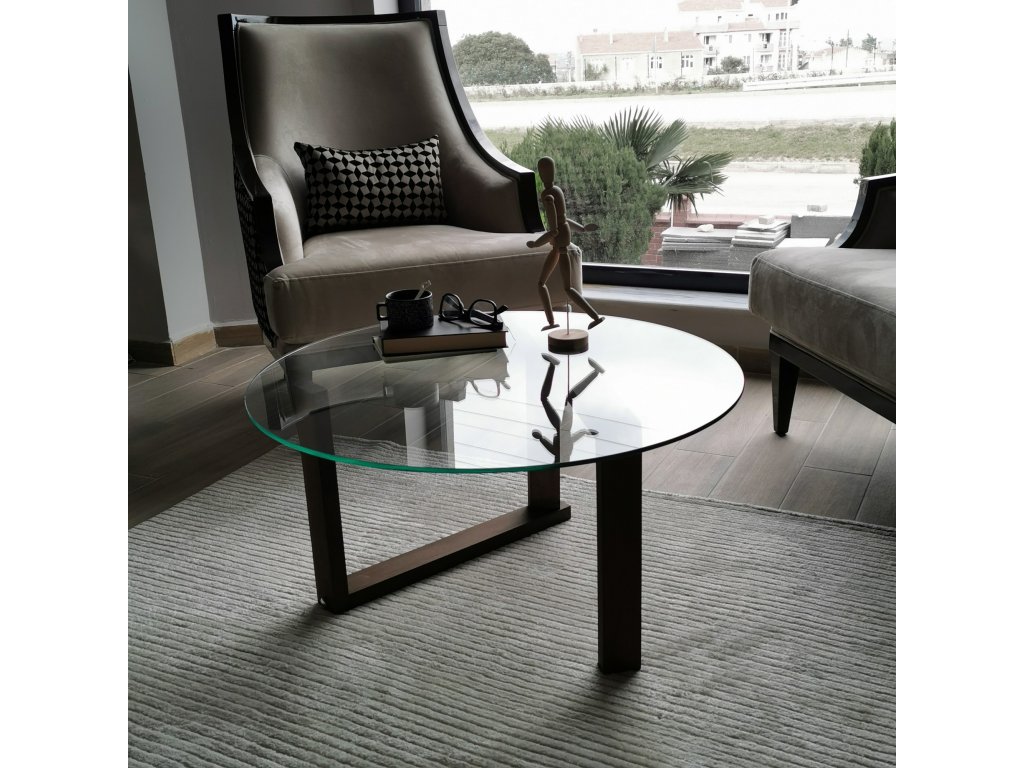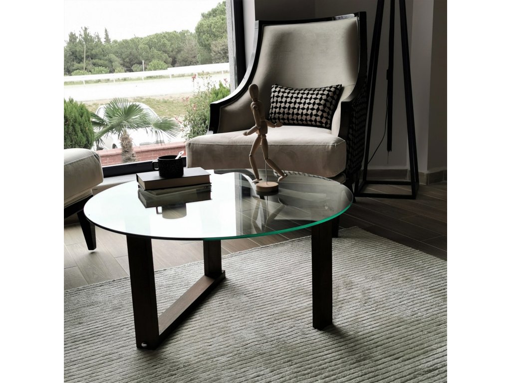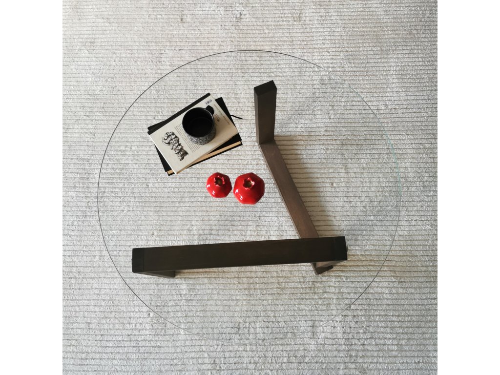 Konferenční stolek ORTA je designově atypický, kdy moderní dřevěný stojan drží kruhovou desku z 6mm silného tvrzeného čirého skla.