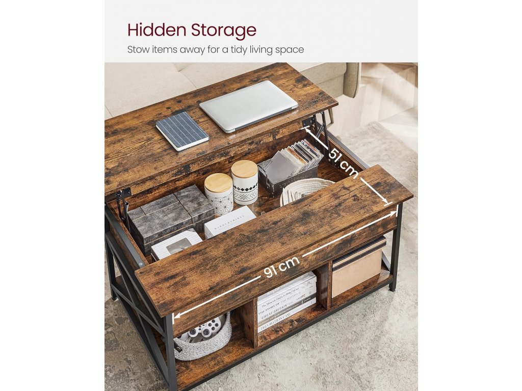 Je vyrobený z ocelového rámu černé barvy a z desek v rustikální hnědé barvě.