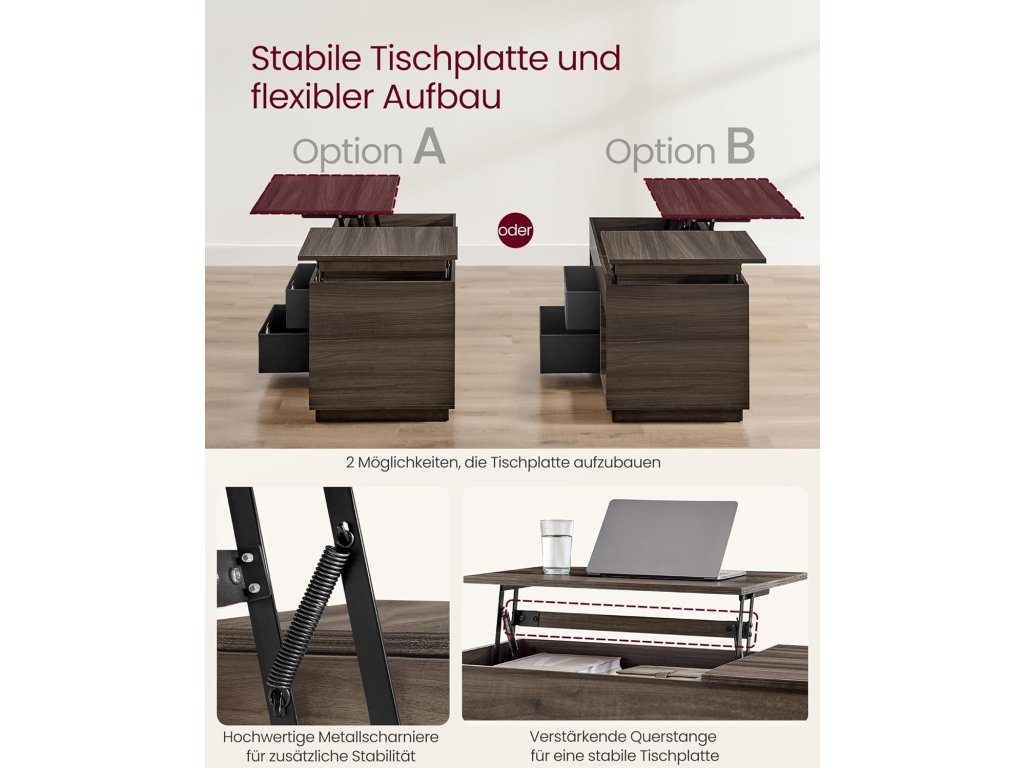 Konferenční stolek má dvousměrný zvedací mechanismus, který otevírá dvě nezávislé plochy. Větší část lze namontovat tak, že ji lze posunout dopředu nebo dozadu.