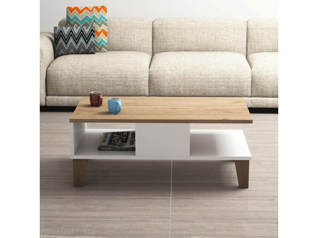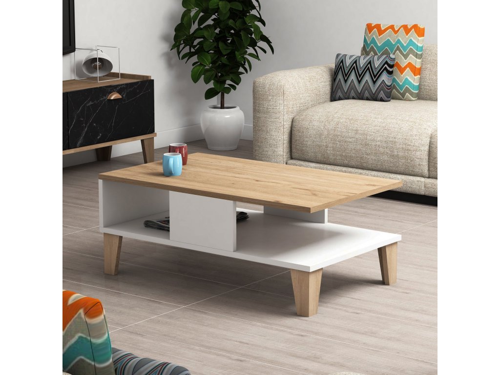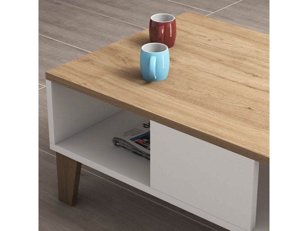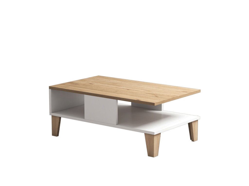 Dvoupatrový konferenční stolek SUMER je v oblíbené barevné kombinaci bílé a dubového dřeva.