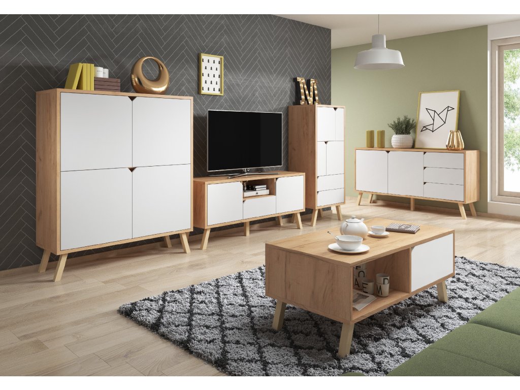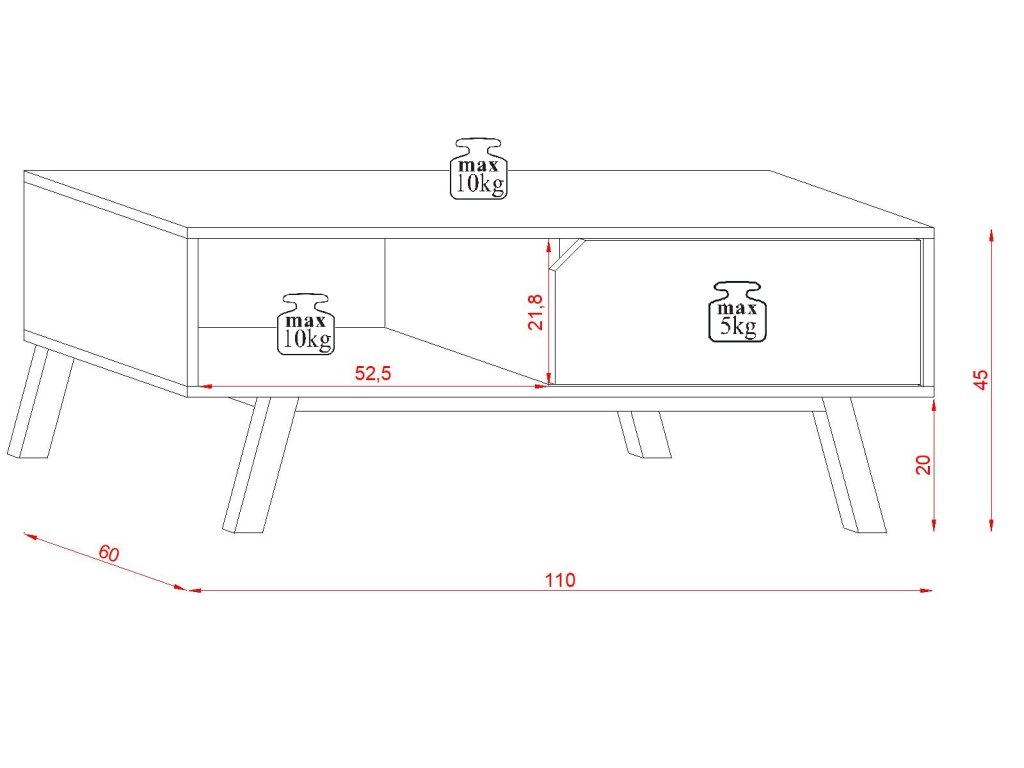 Nábytek stojí na čtyřech dřevěných nohách o průměru 20 cm, které mu dodávají lehkost. Pod horní deskou je další prostor, kde jedna polovina je otevřená přihrádka a druhá polovina je uzavřená zásuvka.