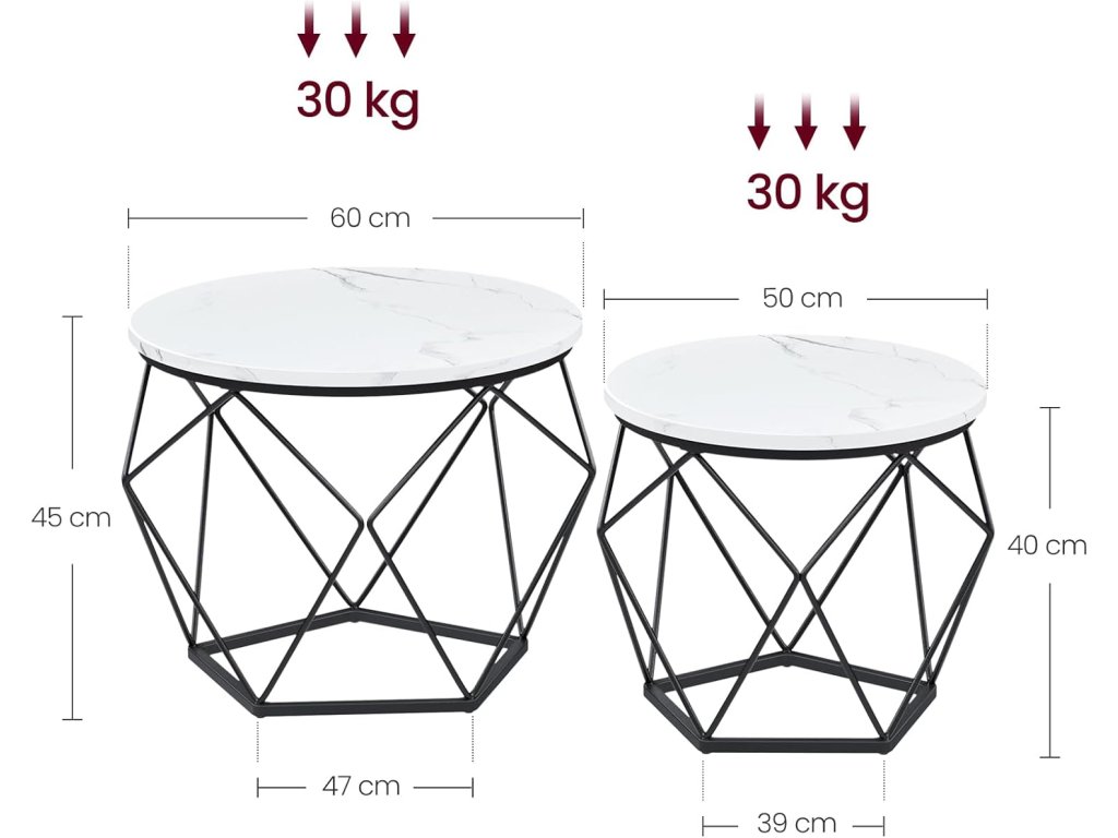 Velký konferenční stolek má rozměry 50 x 40 cm (průměr x výška) a malý konferenční stolek má rozměry 40 x 36 cm (průměr x výška). Kompaktní rozměry vhodné do malých prostor vám umožní najít to správné místo pro odpolední čaj, dekorace nebo notebook na práci.