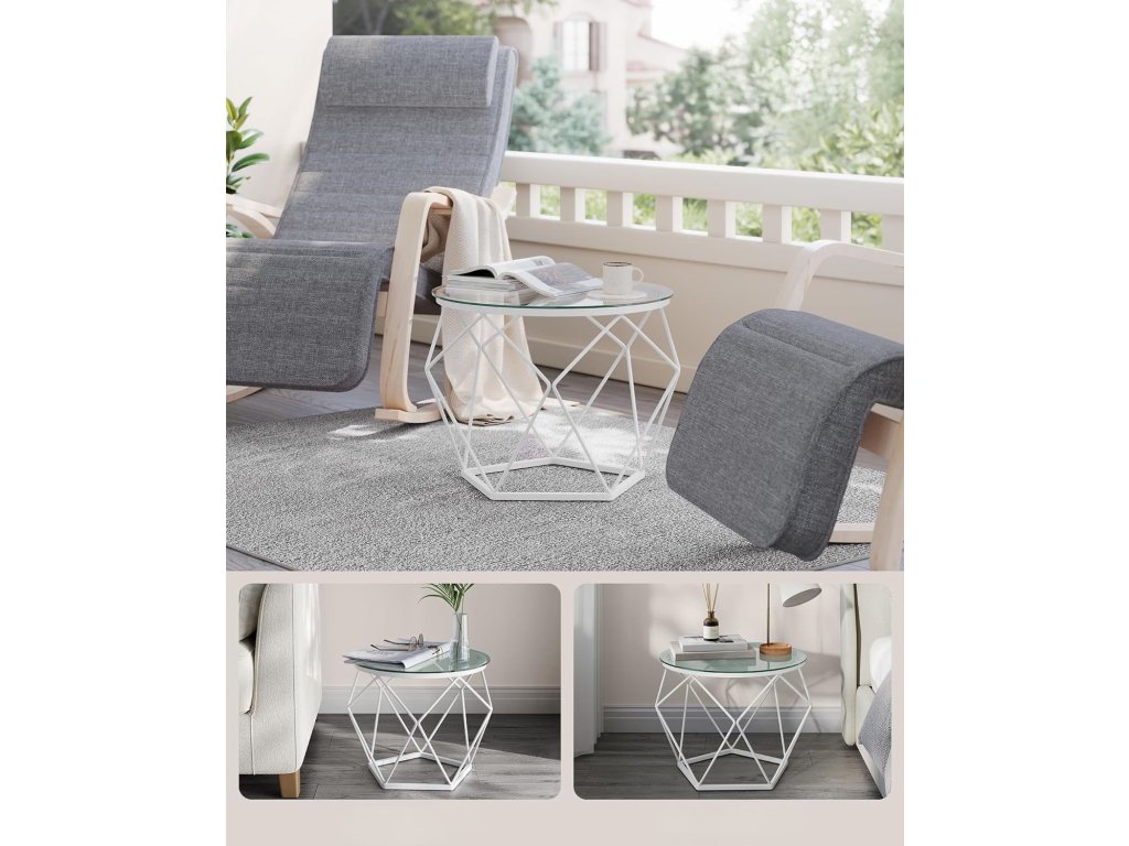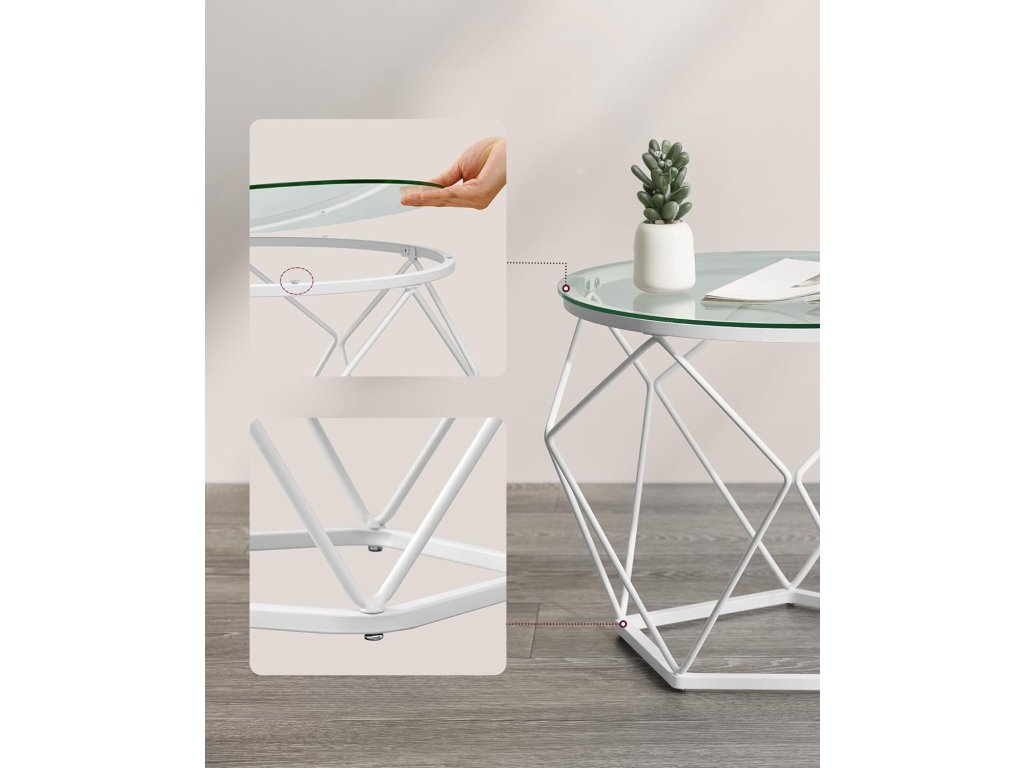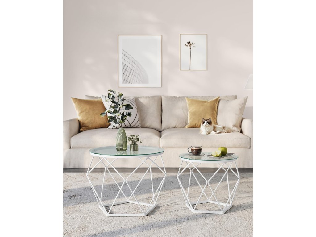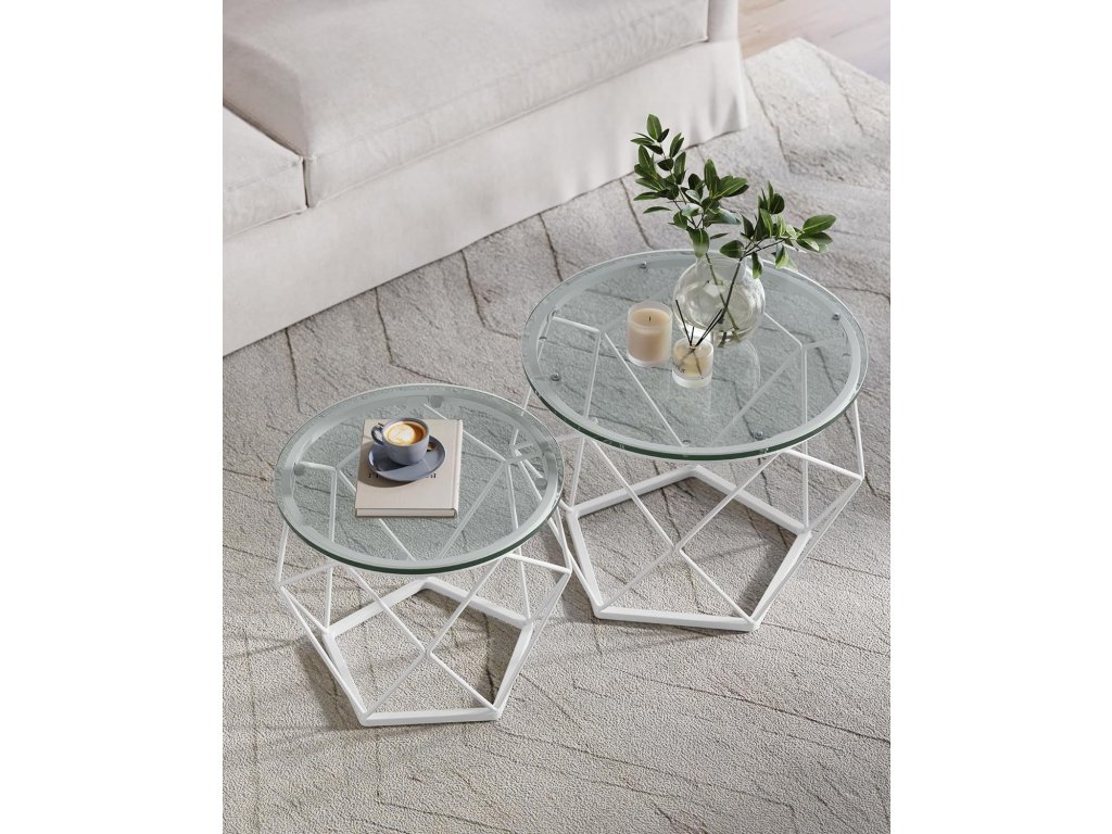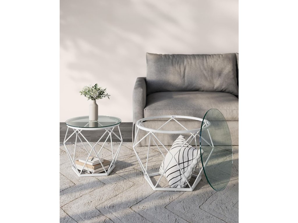 Tato sada stolků vašemu domovu vdechne moderní vzhled. Kulatými skleněnými deskami a bílými geometrickými rámy z oceli okouzlí vaše hosty a dodají vašemu prostoru eleganci a svěžest.
