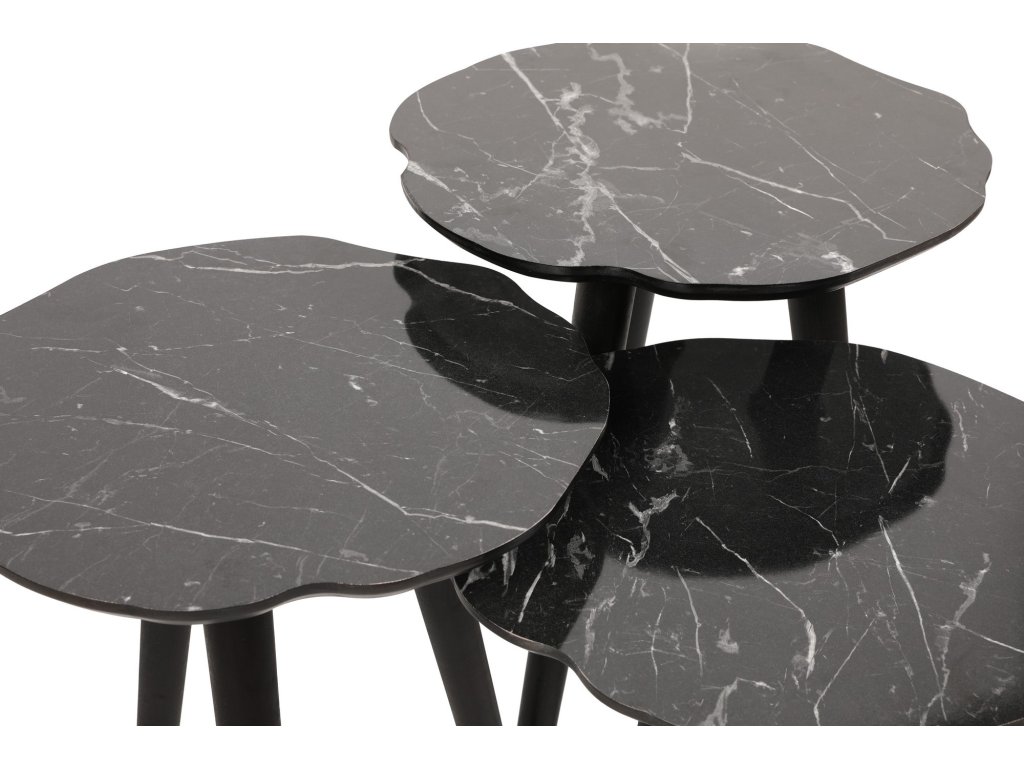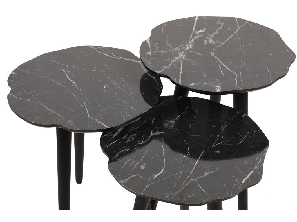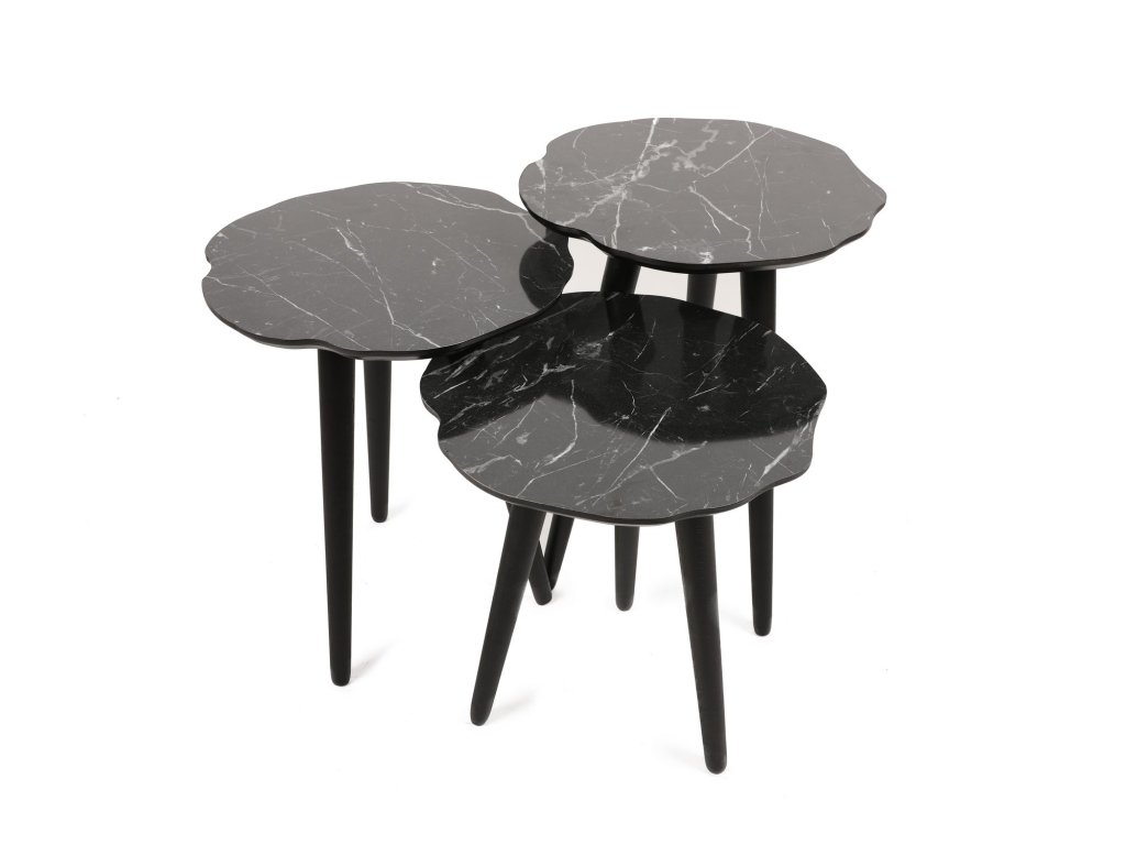 FORGA je sada tří konferenčních stolků, jejichž tvarované kruhové odkládací desky v dekoru černého mramoru sedí na třech černých kónických nožhách.