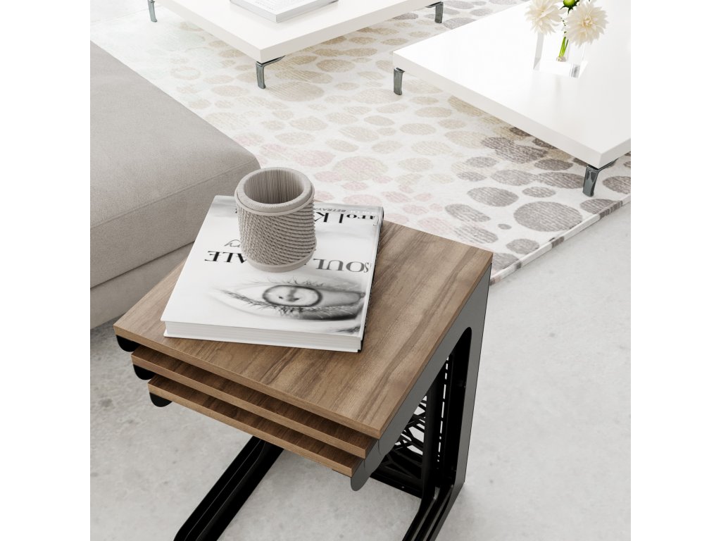 Set konferenčních stolků HARE je vyrobený ze tří černých kovových konstrukcí, které nesou čtvercové desky v dekoru ořech.