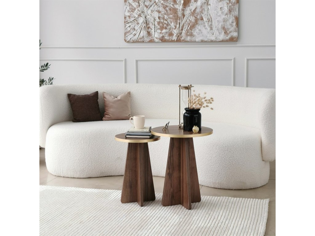 Díky úžasné kombinaci zlaté a ořechové barvy se naše sada konferenčních stolků bez námahy začlení do jakéhokoli interiéru a dodá vašemu prostoru nádech bohatství. Bohaté tóny a elegantní design vytvářejí podmanivý ústřední bod, který zanechá vaše hosty v úžasu.