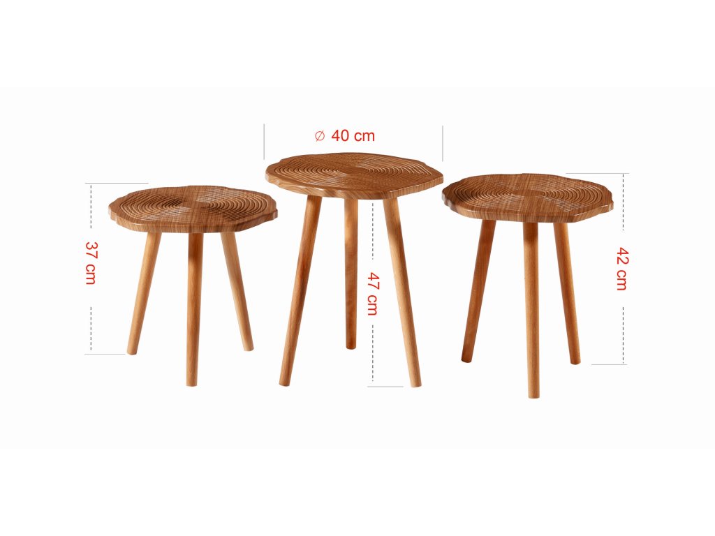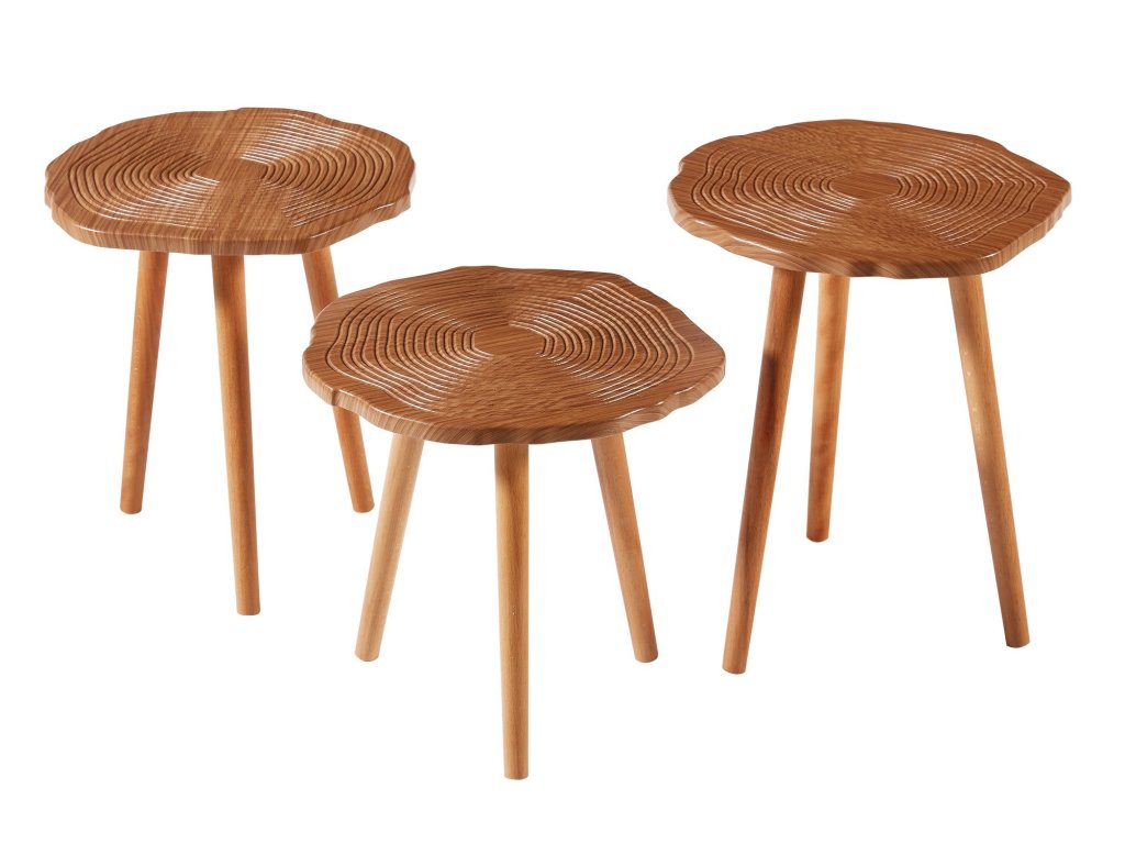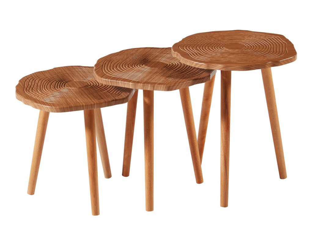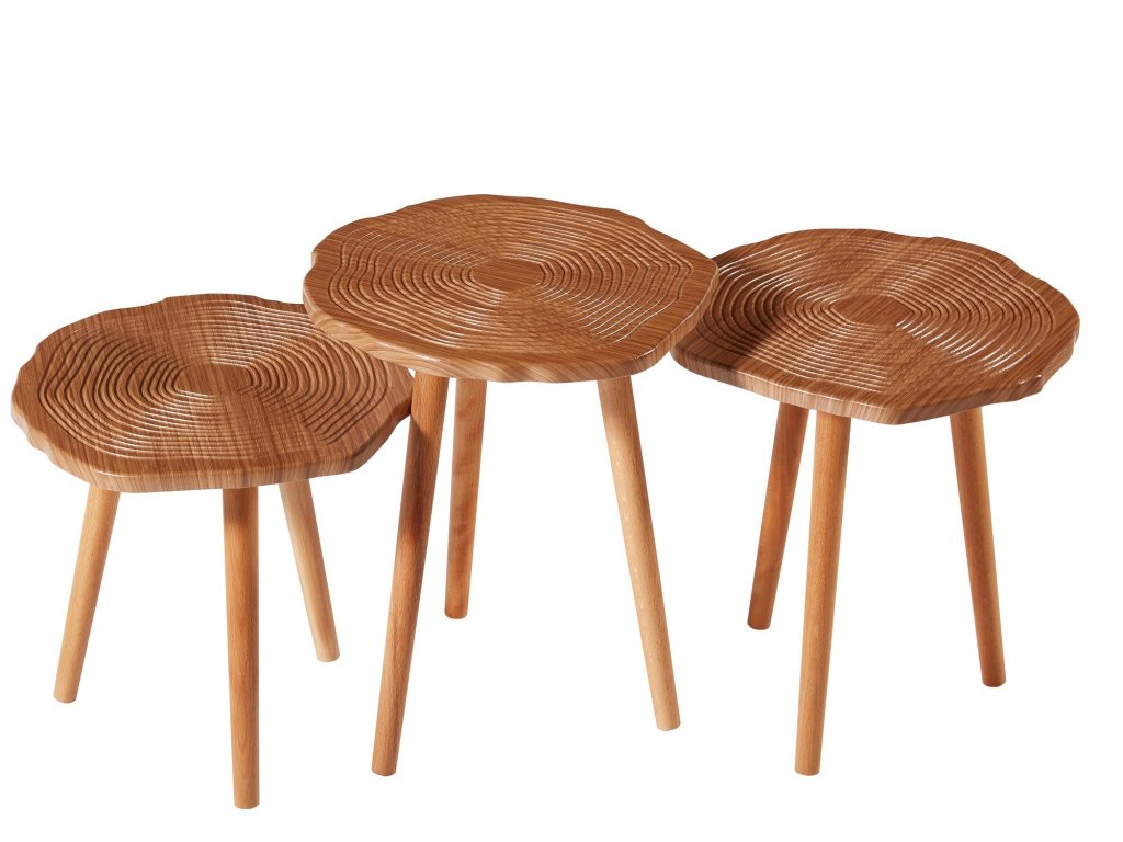 Set konferenčních stolků TUVALLE představuje tři stolky stojící vždy na třech bukových nožkách s nepravidelně tvarovanými deskami pokrytými membránou představující letokruhy.
