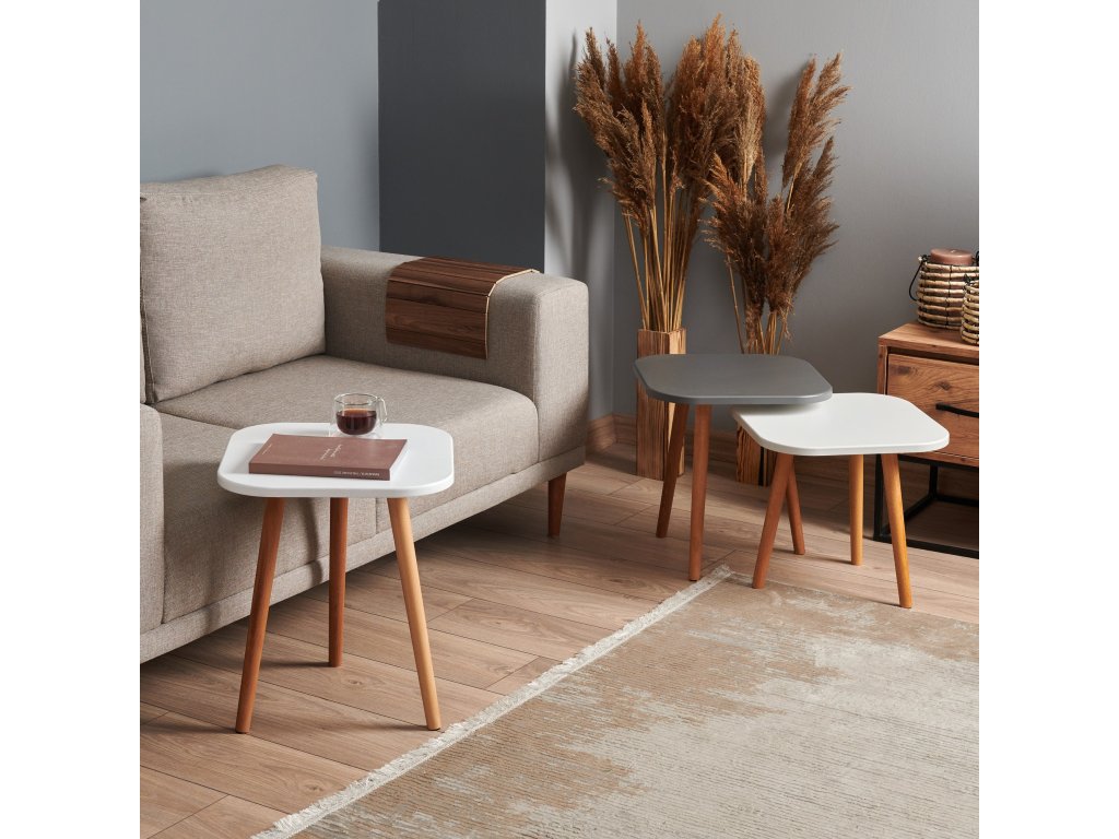 Set konferenčních stolků TUVALLE představuje tři stolky s různými čtvercovými deskami v barvách antracitové, šedé a v dekoru dub, jež jsou usazené vždy na třech bukových nožkách.