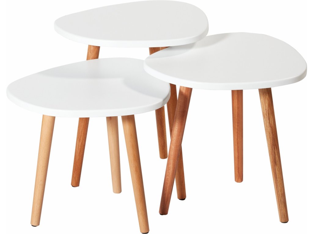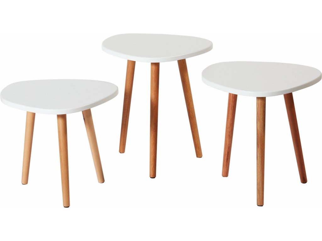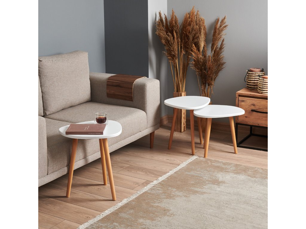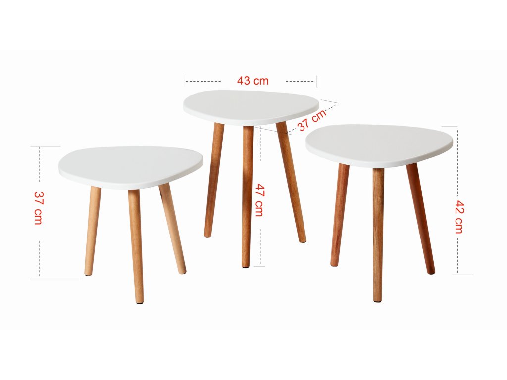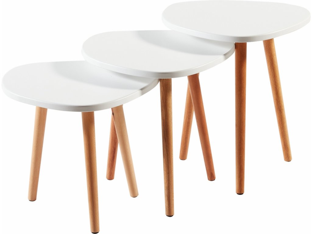 Set konferenčních stolků TUVALLE je vyrobený ze tří bílých desek, které jsou usazené vždy na třech bukových nožkách.