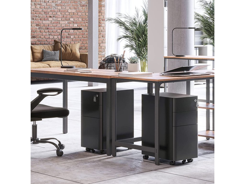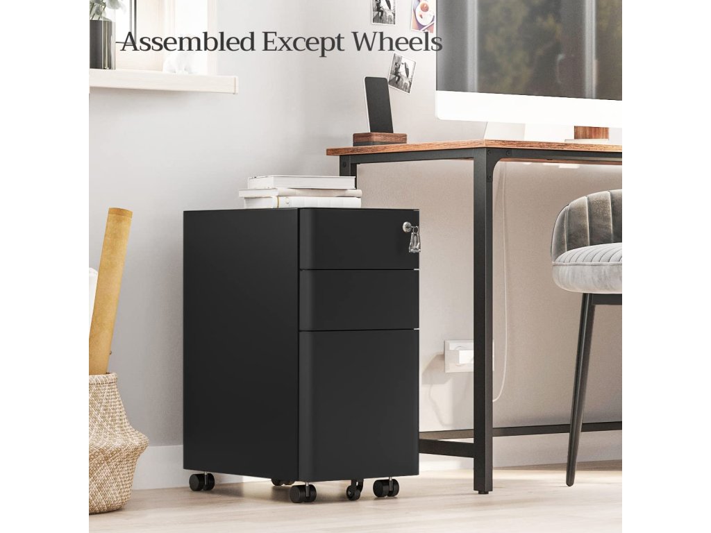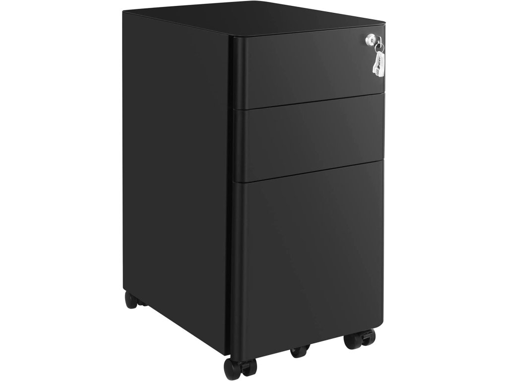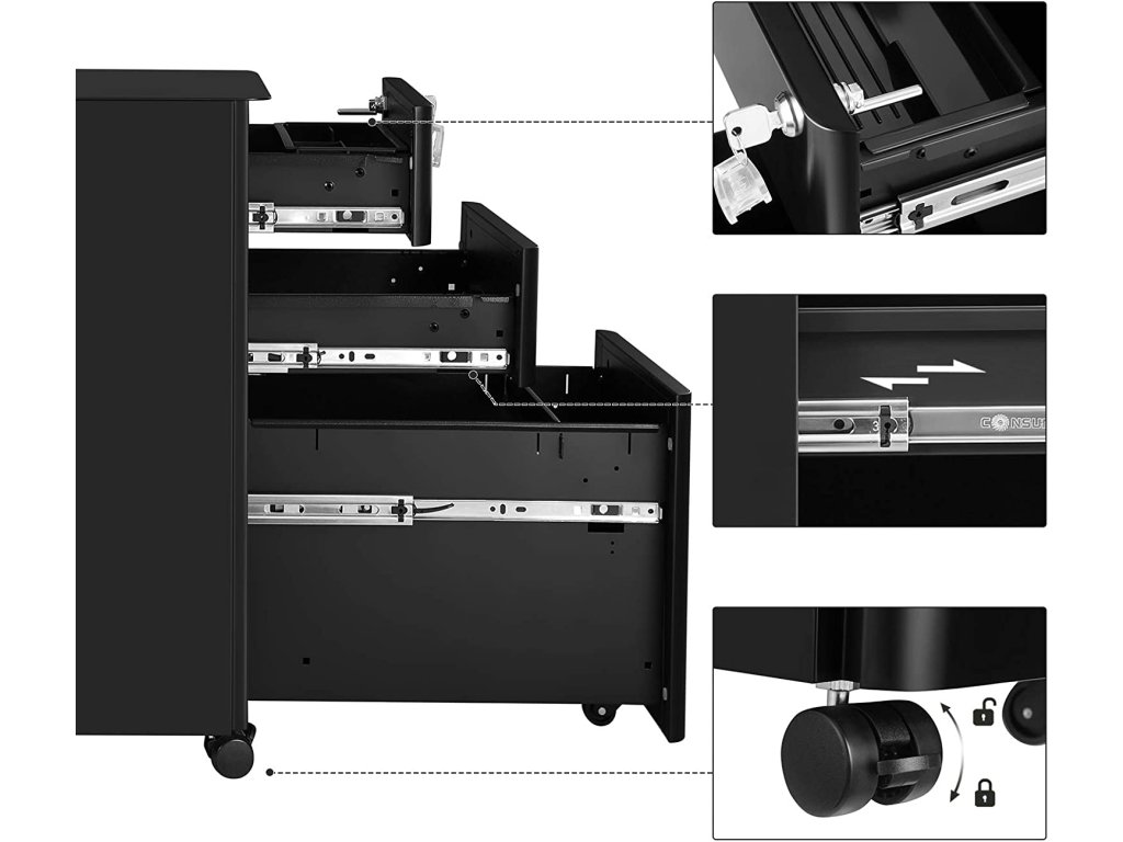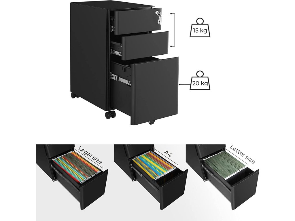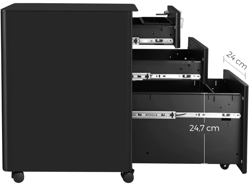 Černá pojízdná kancelářská skříňka na spisy je vyrobená z oceli a je uzamykatelná.