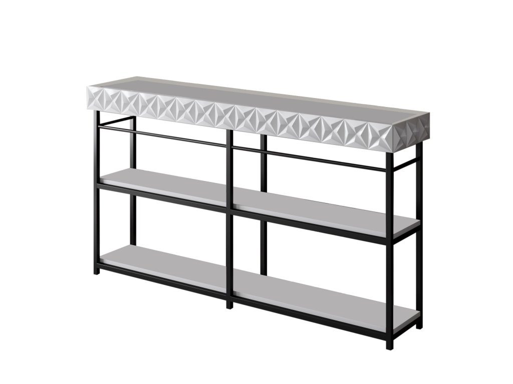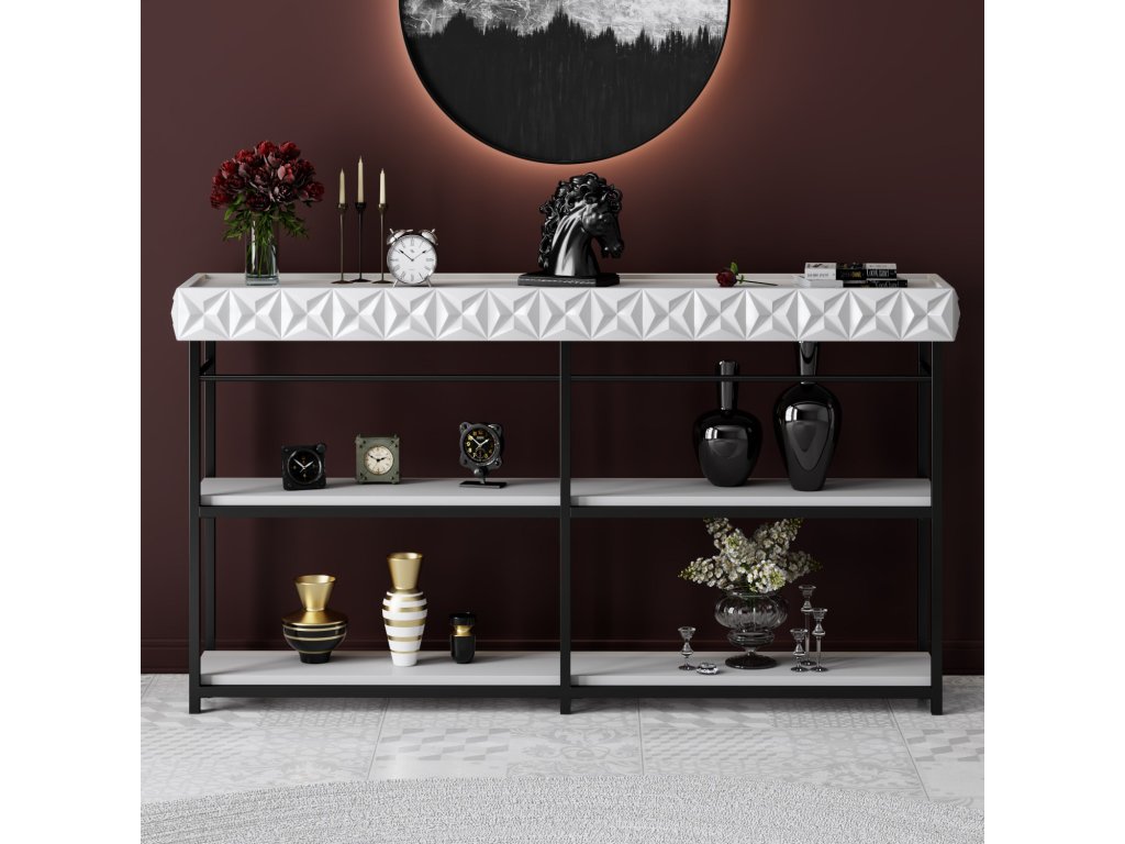 Konzolový stolek ZUMRUT nabízí tři bílé odkládací plochy usazené v černých kovových rámech sloužících současně jako bočnice i nohy.