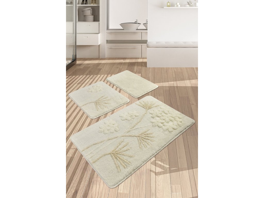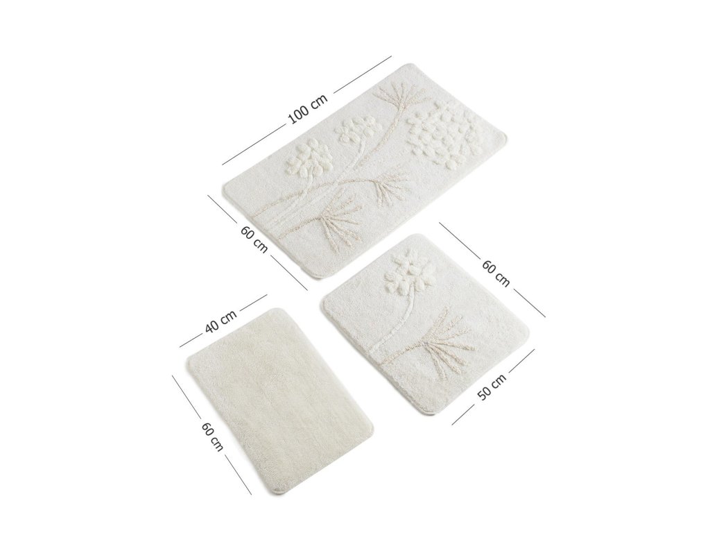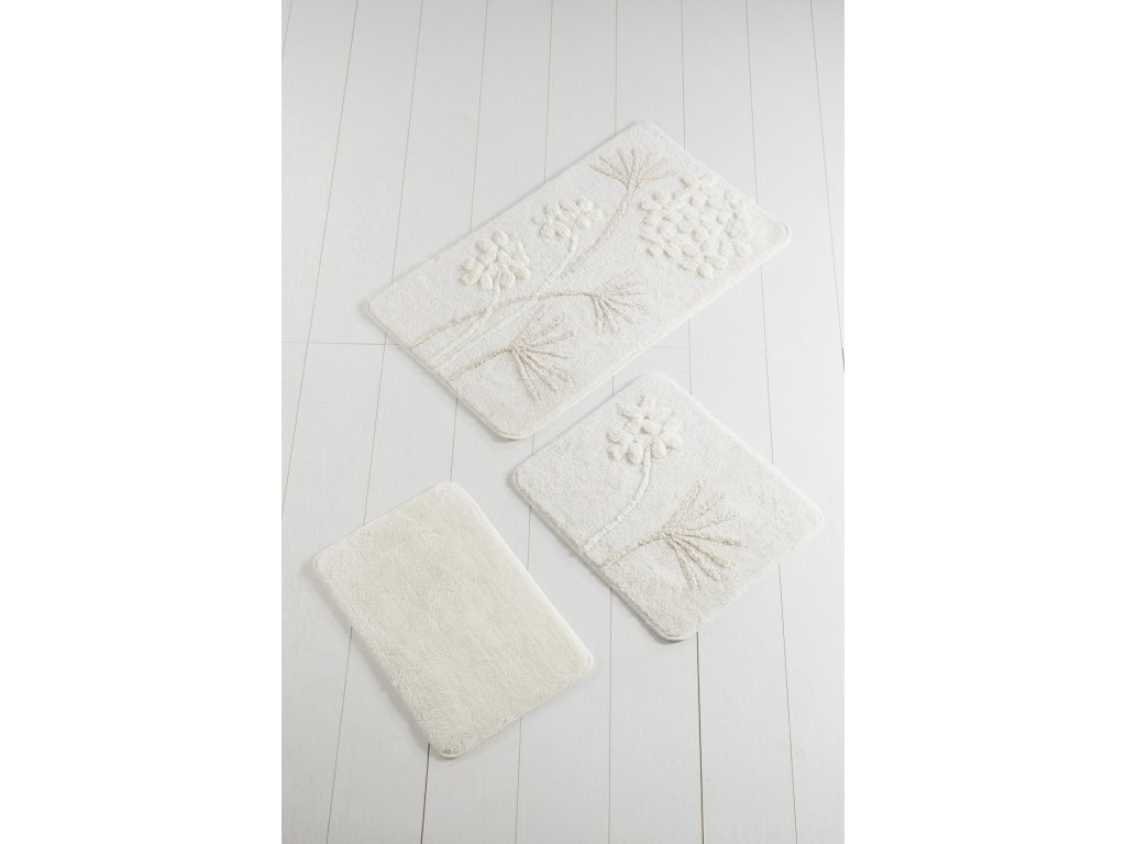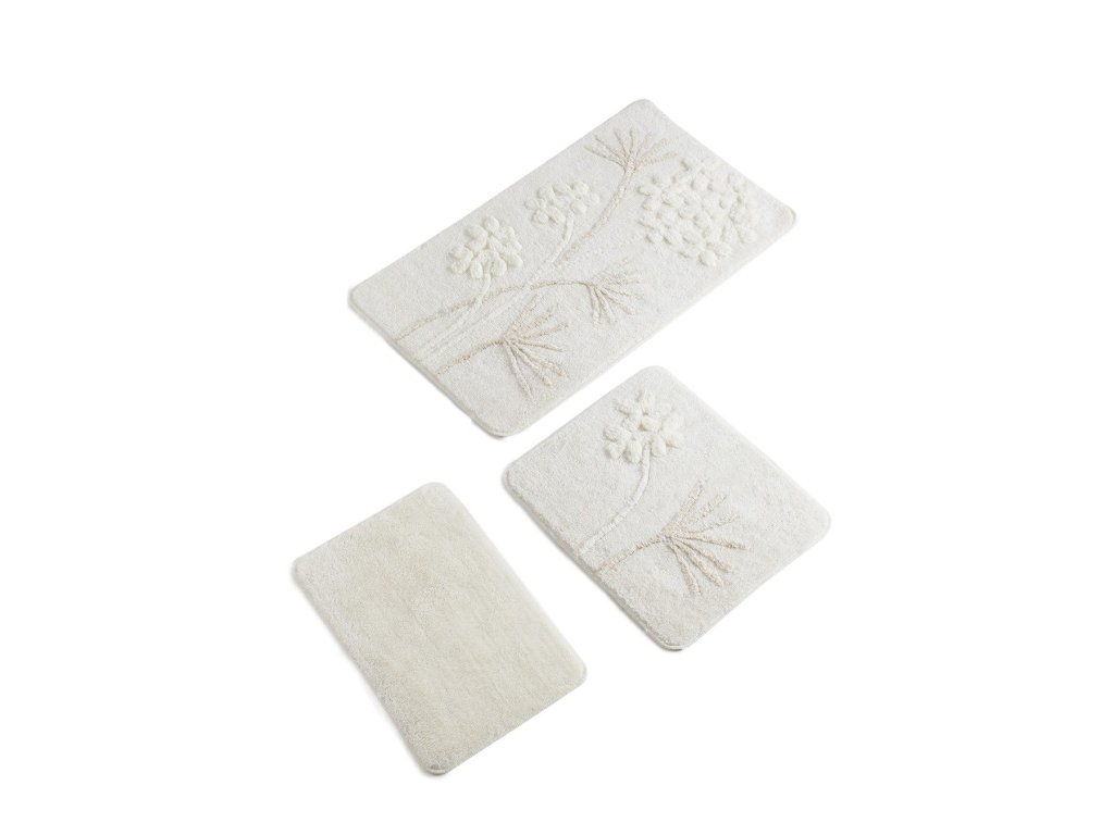 Sada tří rohoží do koupelny v jemné barvě ecru se vzorem květin.