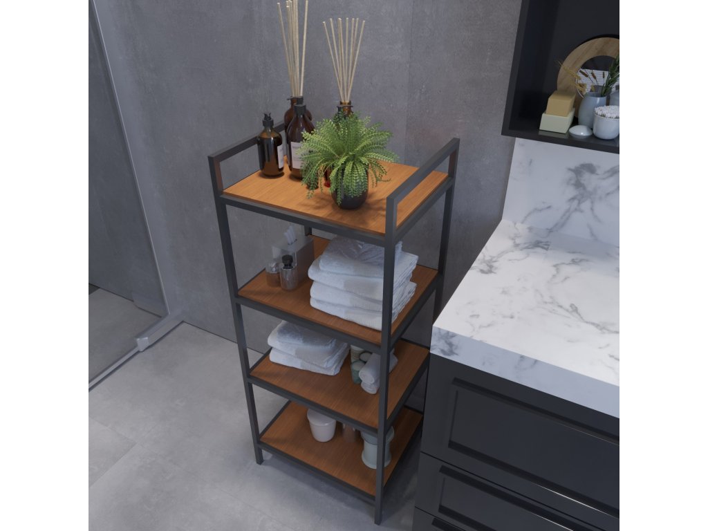 Moderní koupelnový regál v barevné kombinaci ořechu a černé.