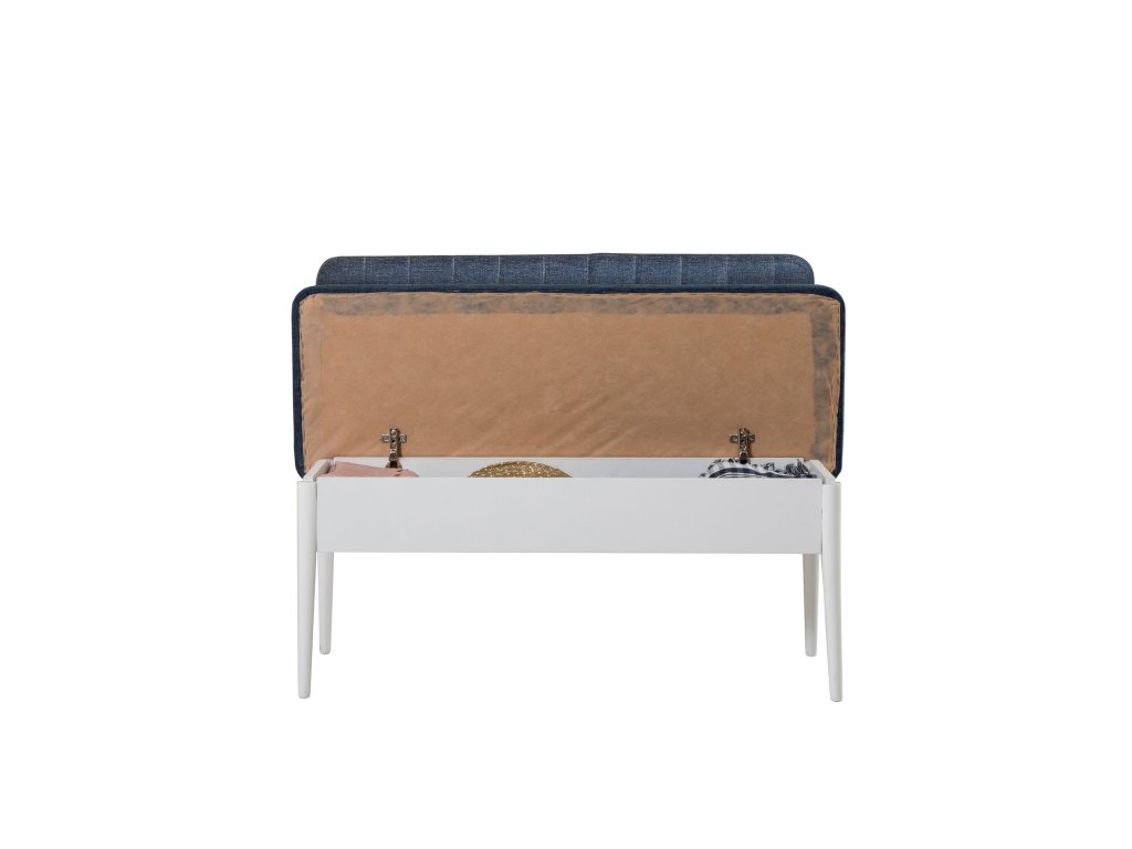 Jídelní lavici VINA tvoří bílé tělo s úložným prostorem a modré polstrování.