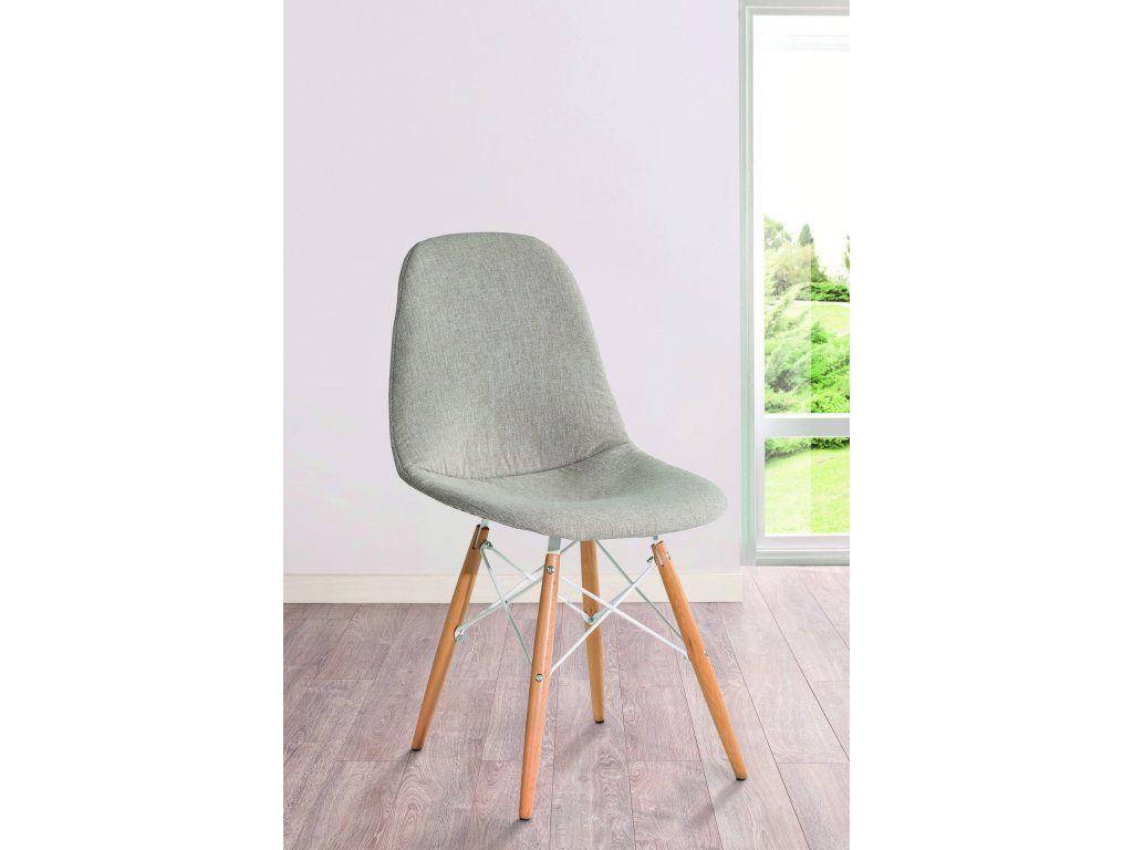 DYNAMIC je moderní židle s šedým čalouněním stojící na dřevěných vyztužených nohách.