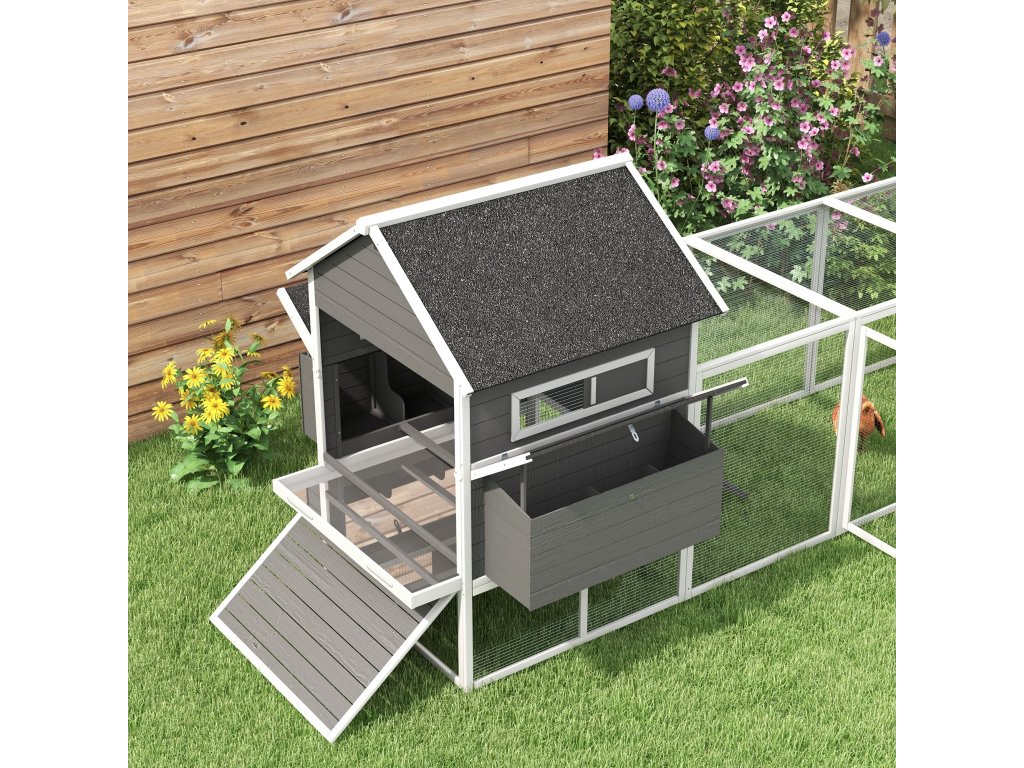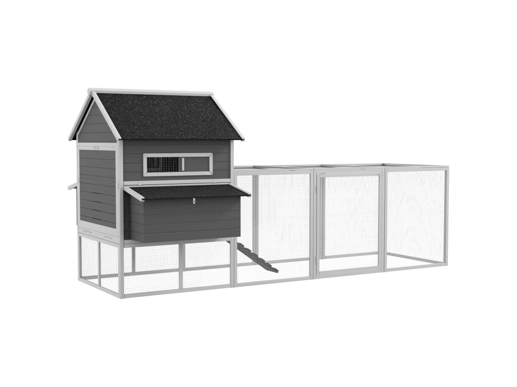 Dvoupatrový kurník s kukaní a výběhem pro volný chov drůbeže jedlové dřevo 347 x 150 x 160 cm šedá