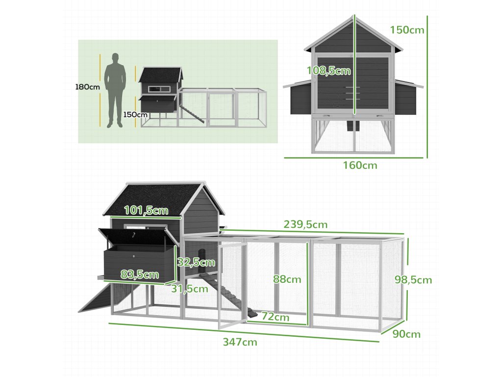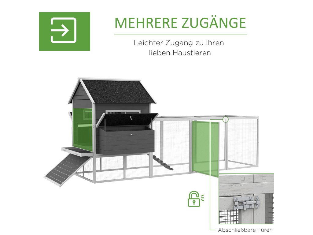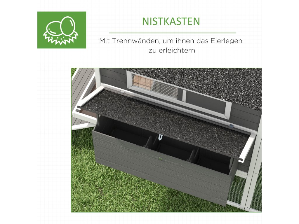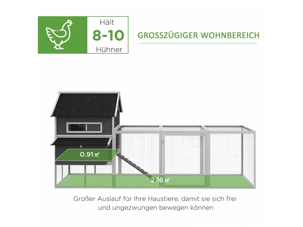 - Robustní konstrukce ze smrkového dřeva s vyvýšeným kurníkem, hnízdními boxy, rampou, dvířky a sousedním výběhem