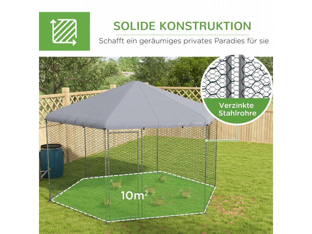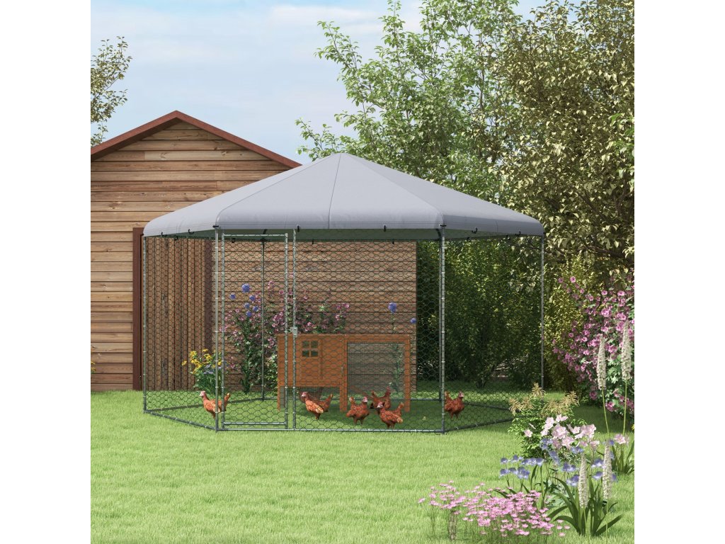 Objevte prostorný výběh pro kuřata od společnosti PawHut, který nabízí nejen místo pro mnoho kuřat, ale také volnost pohybu uvnitř. Ochranná šestihranná střešní konstrukce kurníku poskytuje stín a udržuje vaše zvířata v suchu, zatímco vysoce kvalitní pozinkované pletivo a robustní ocel chrání před predátory a zároveň zajišťují optimální cirkulaci vzduchu.