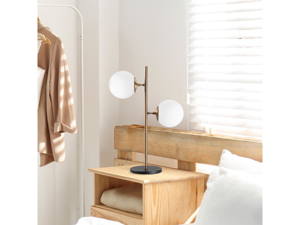 Mosazná stolní lampička FAZLI je tvořena kruhovou černou základnou a mosazným ramenem se dvěma bílými skleněnými stínítky.