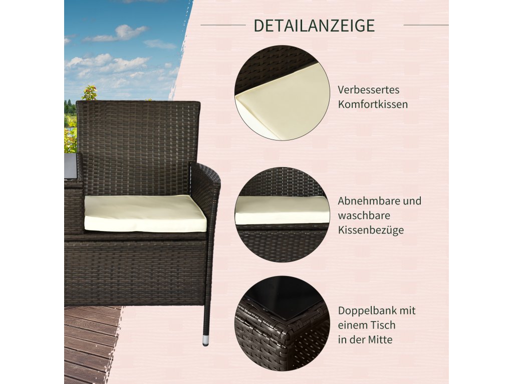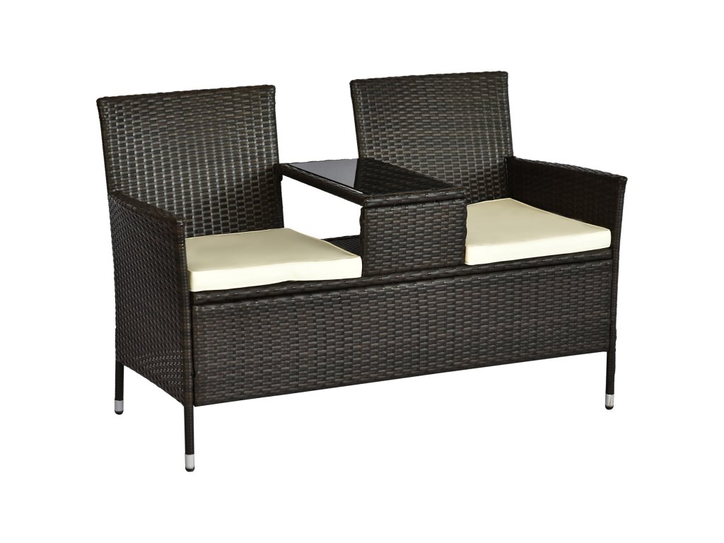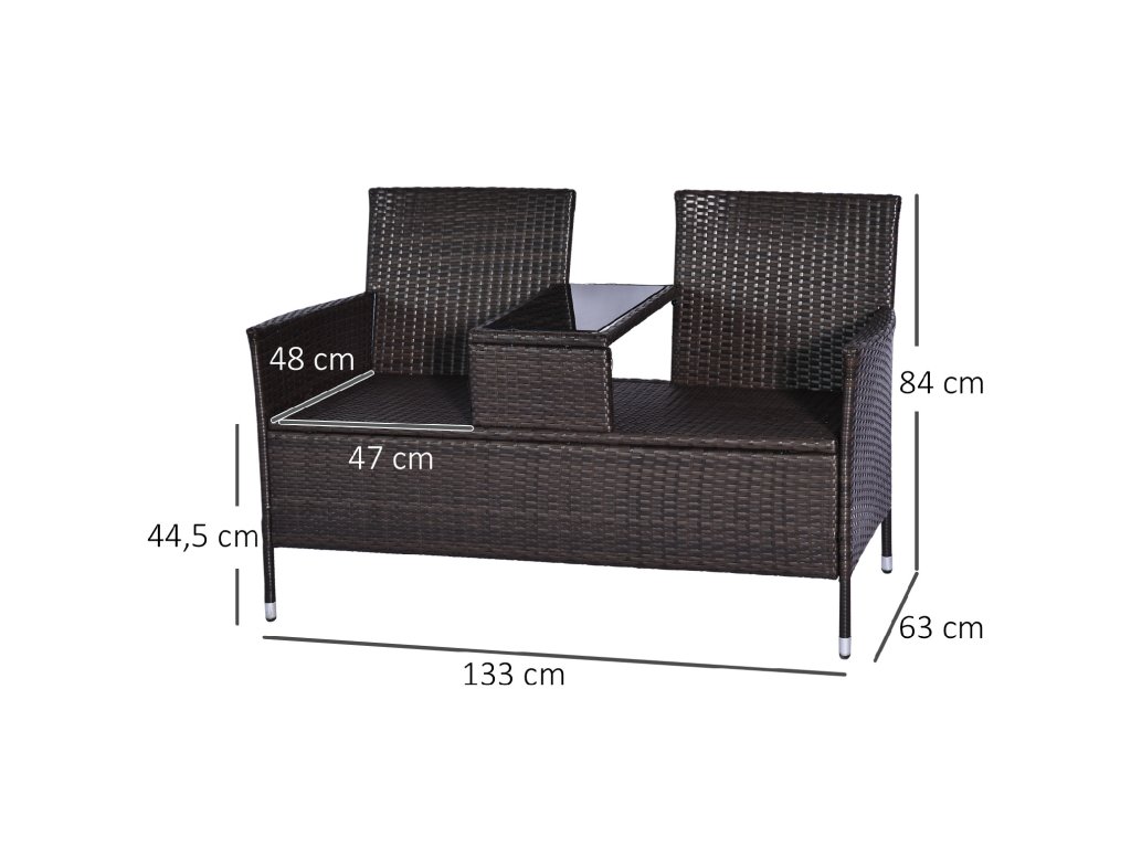 Pokud hledáte pohodlné sedadlo s úložným prostorem pro odpočinek na zahradě nebo na terase, najdete to, co hledáte, v naší pohodlné zahradní lavici pro 2 osoby od společnosti Outsunny. Naše 2místná zahradní lavice je ideální pro venkovní použití díky polyratanovému výpletu odolnému proti vodě a špíně a UV záření. Součástí balení jsou dva měkké polstrované sedáky s odnímatelnými potahy, takže se vám bude pohodlně sedět. Vaše šálky, sklenice nebo jiné předměty můžete odložit na integrovaný stolek.