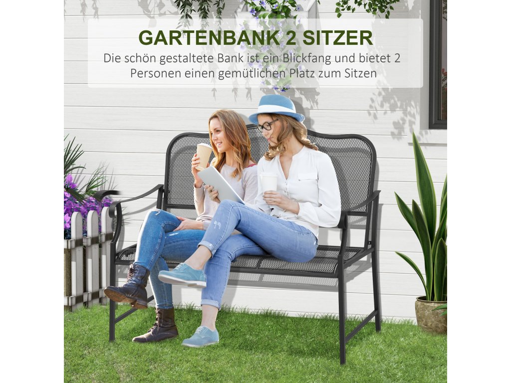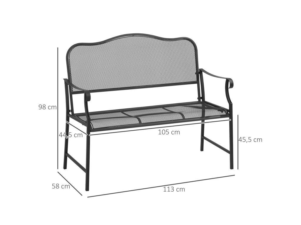 Vneste do své zahrady jednoduchou eleganci s touto nostalgickou kovovou lavičkou od společnosti Outsunny. Nabízí útulné posezení pro dvě osoby. Pevná kovová konstrukce je robustní, odolná vůči povětrnostním vlivům a trvanlivá. Sedák z jemné kovové síťoviny zabraňuje hromadění vody a vysoké opěradlo a pohodlné područky lavice nabízejí vysokou úroveň pohodlí při sezení. Udělejte si opět čas na pohodlné posezení, vědomě si vychutnejte zeleň své zahrady a užijte si klid a pohodu.