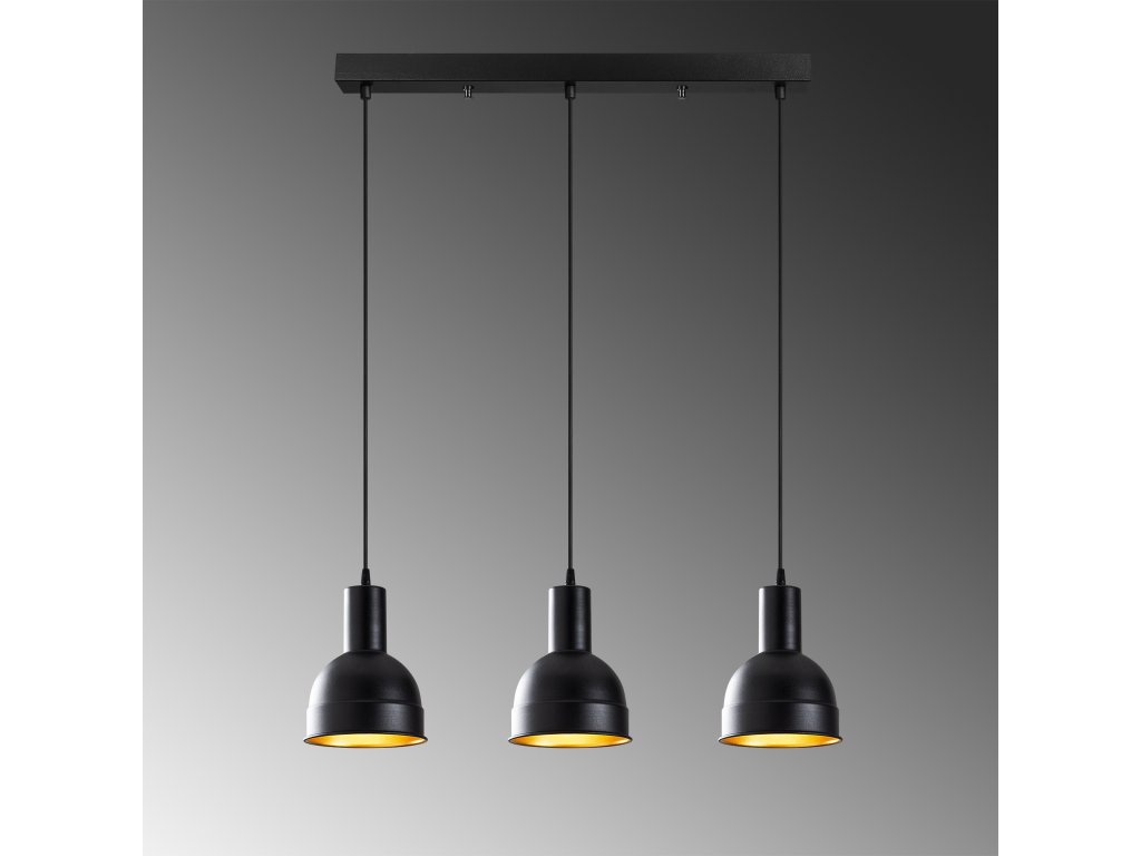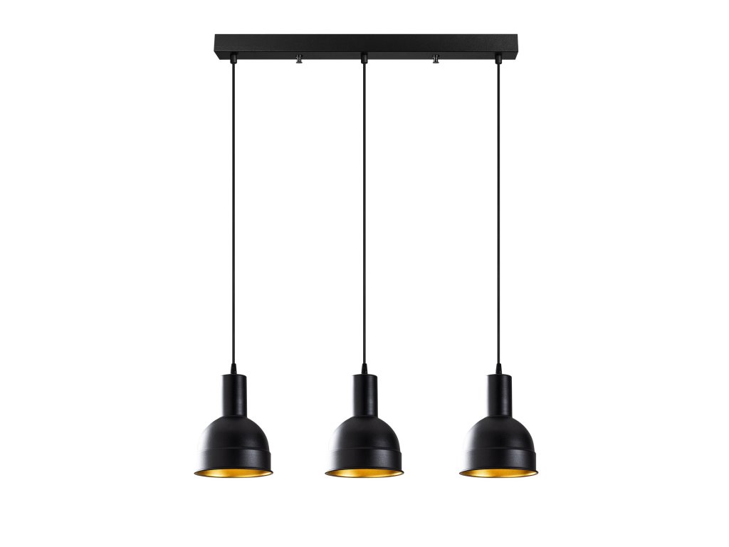 Černý lustr BERCESTE je tvořen podlouhlou základnou, ze které visí tři elegantní stínítka, jejichž zlatý vnitřek umocňuje efekt teplého světla.