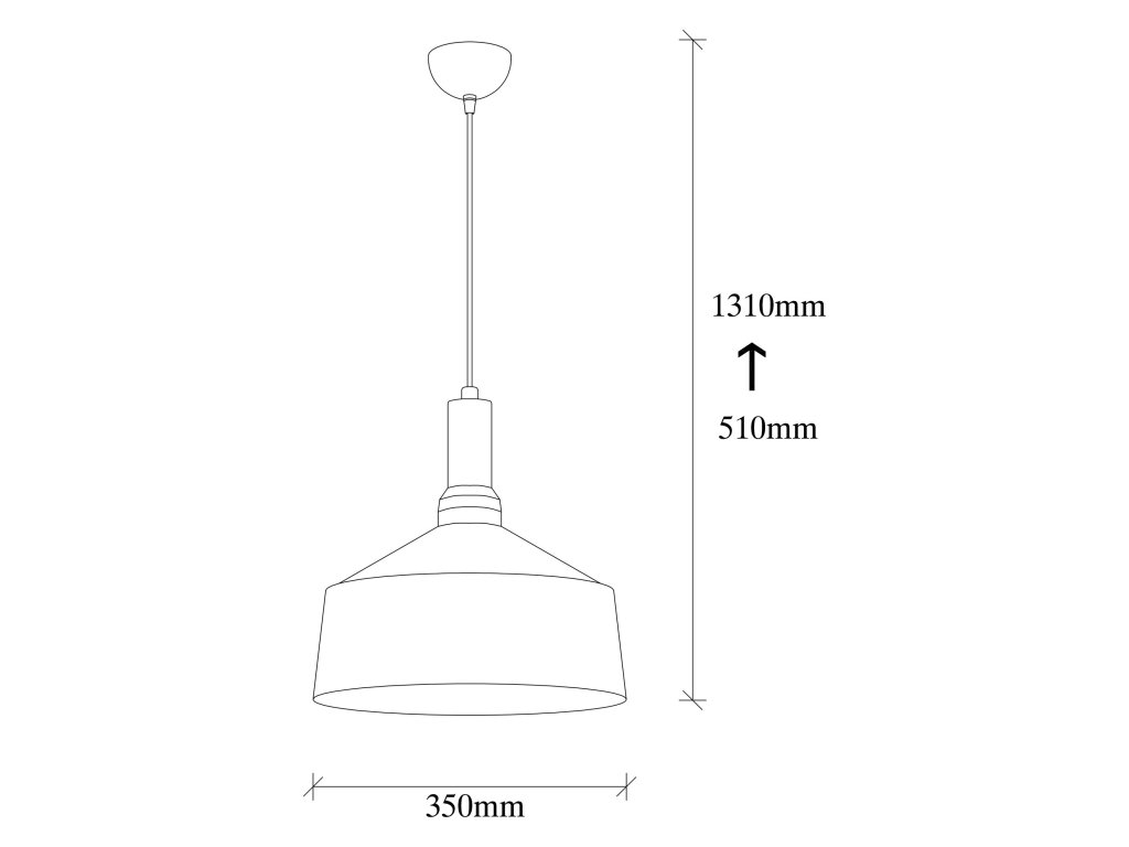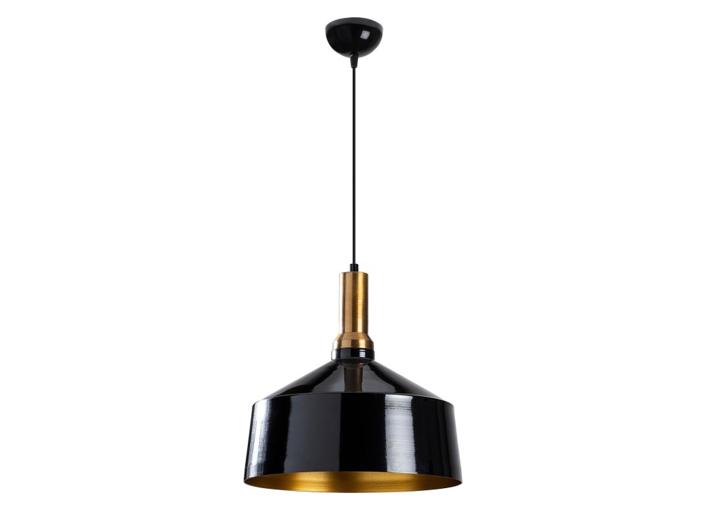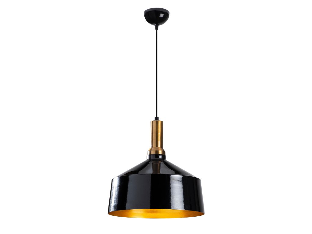 Černý lustr BERCESTE má malou základnu, ze které visí stínítko industriálního typu se zlatým vnitřkem, který vydává žluté teplé světlo.