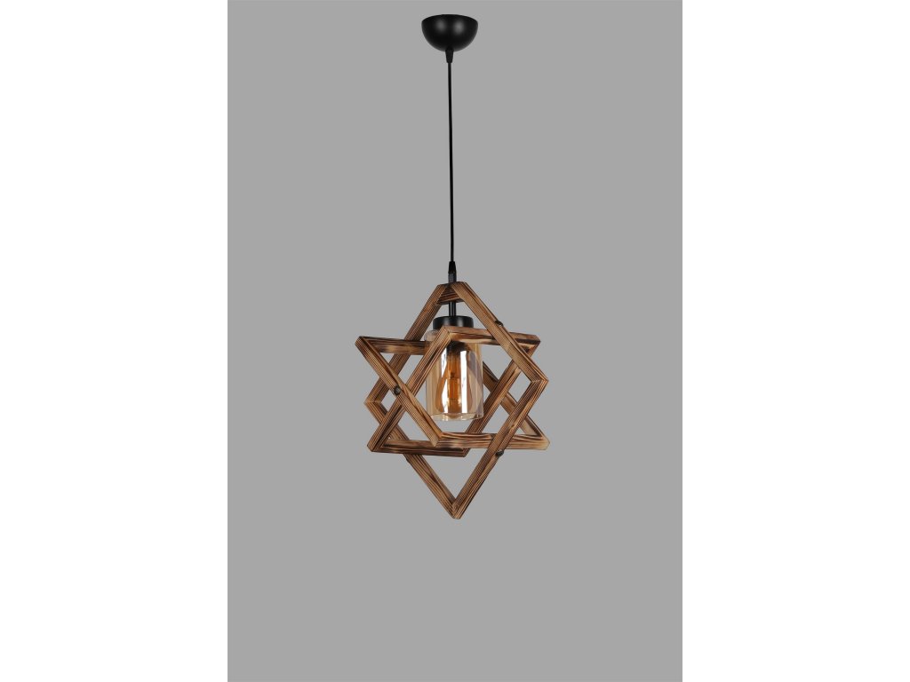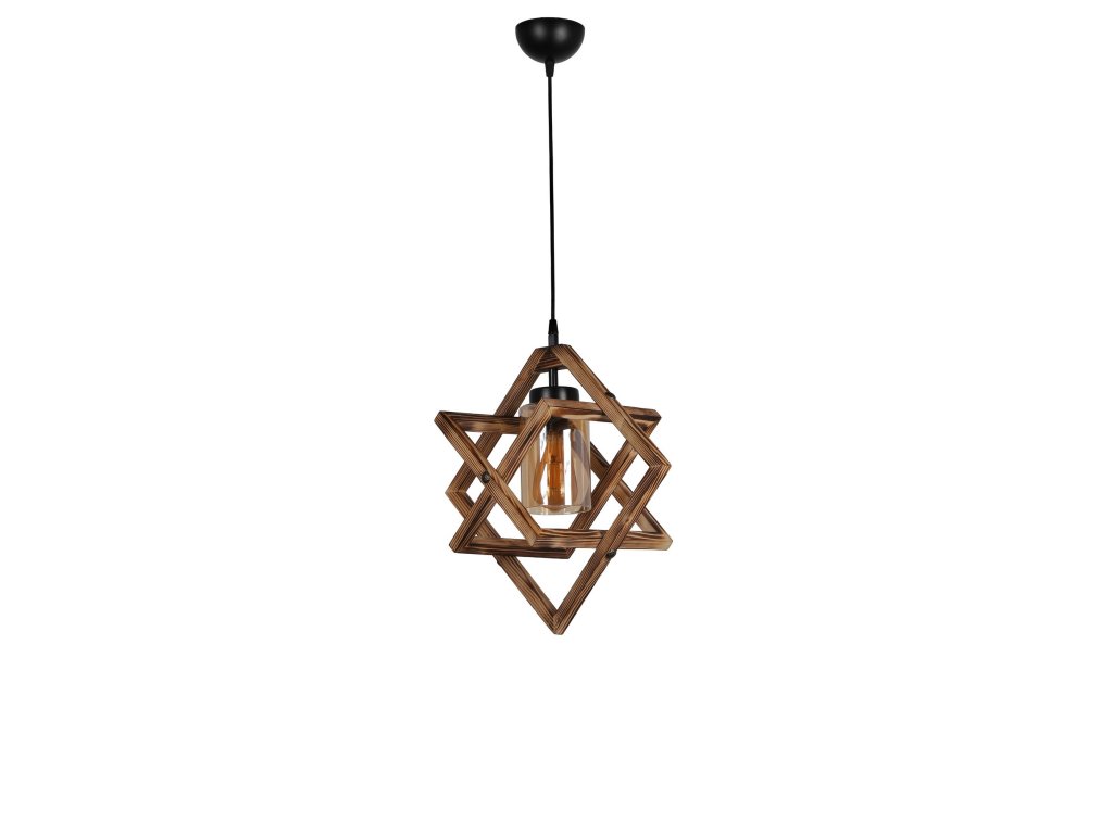 Lustr BERLIN ukrývá za dřevěnými obrazci v hnědé barvě objímku se žárovkou.
