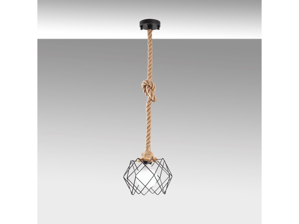 Černý lustr ENDUSTRIYEL 65 je vyroben v industriálním stylu s drátěným stínítkem a motouzovým tělem.