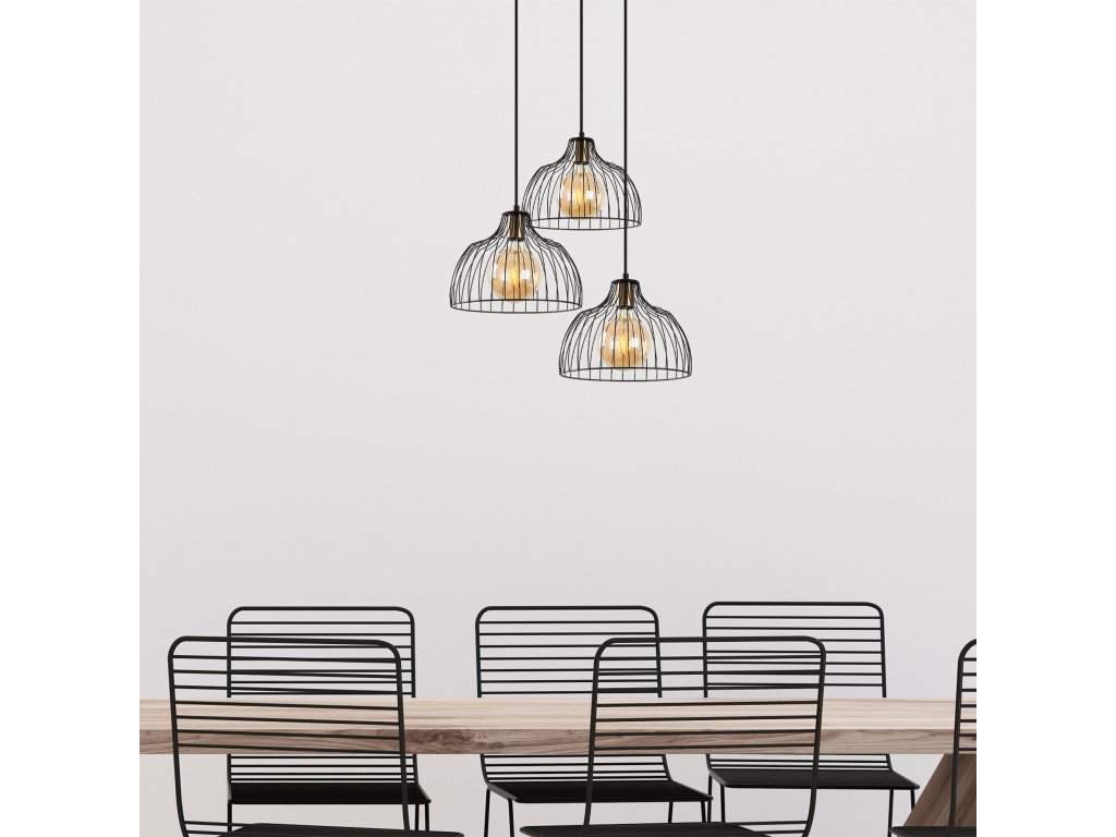 Černý lustr KOZAN je tvořen velkou kruhovou základnou a třemi drátěnými robustními stínítky.
