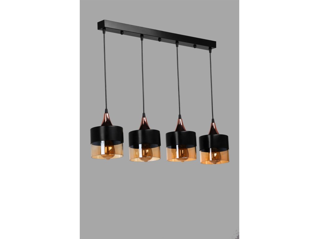 Lustr SAHRA je tvořen dlouhou černou úzkou základnou, ze které visí čtyři stínítka černo-měděné barvy.