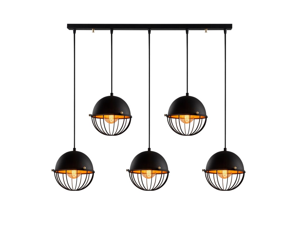 Lustr SIVANI TEL je tvořen podlouhlou úzkou základnou, ze které visí 5 stínítek v industriálním stylu jejichž vnitřky jsou ve zlaté barvě.