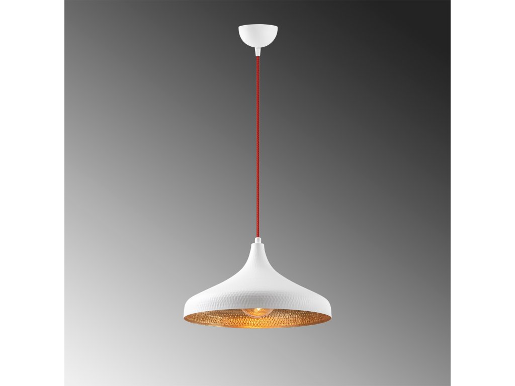 Bílý lustr TATTOO má kruhovou základnu, ze které visí na variabilně dlouhém červeném kabelu stínítko s tepaným tělem.