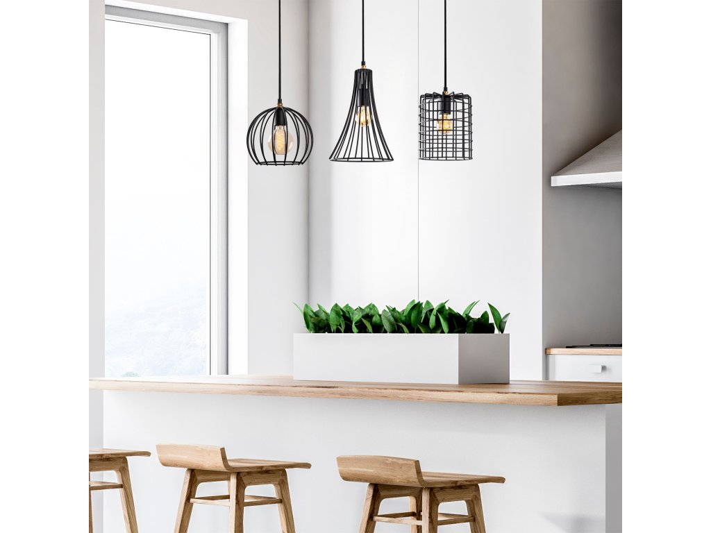 Černý lustr TELTRIO Vás upoutá svými drátěnými stínítky různých tvarů.