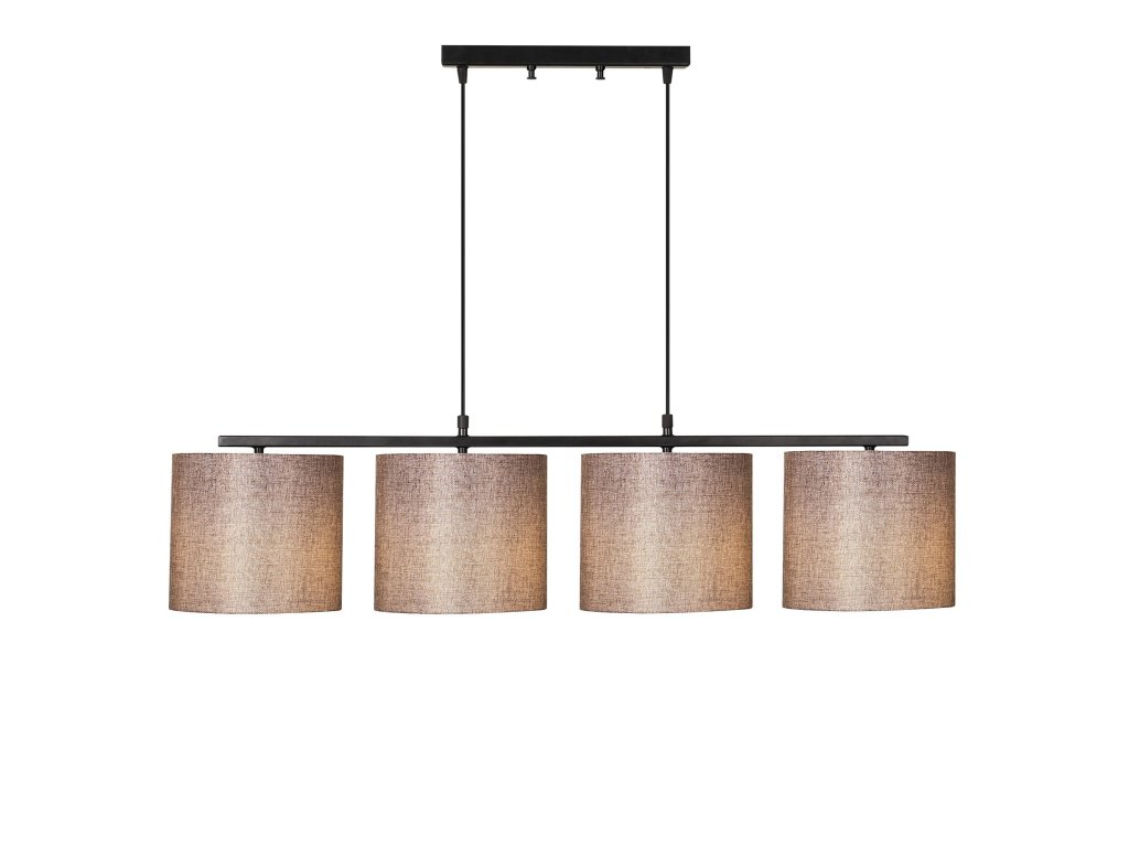 Lustr VALIZ je tvořen čtyřmi stejnými válcovitými stínítky hnědé barvy, které visí z malé černé základny na jedné společné konzoly.