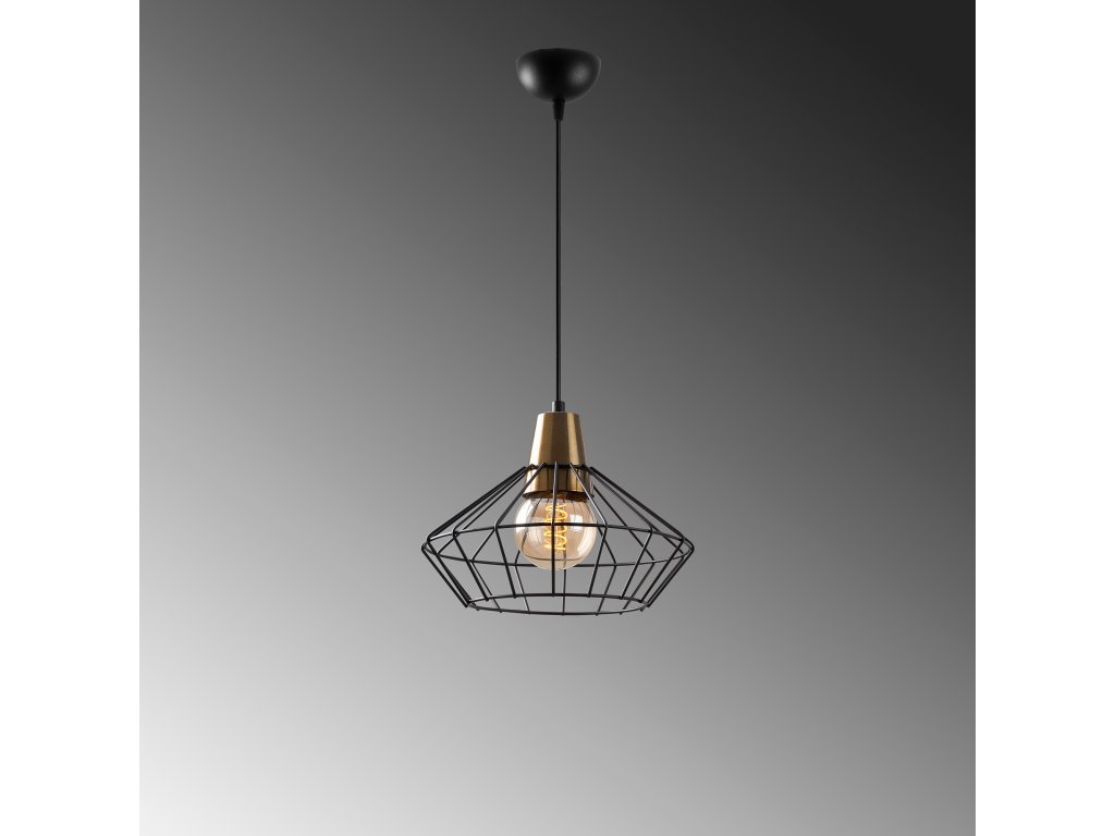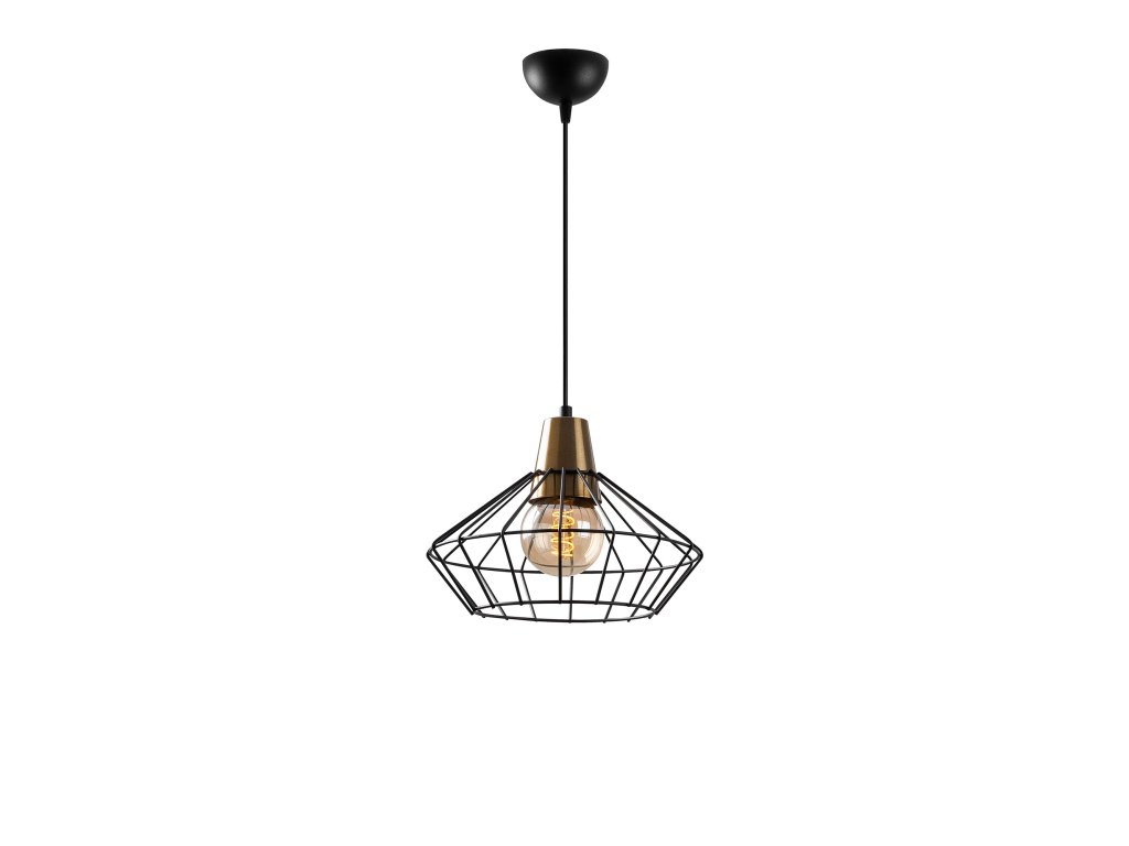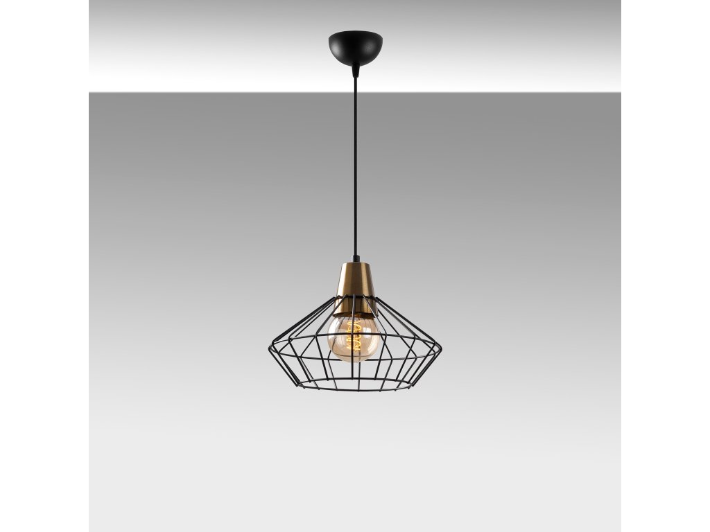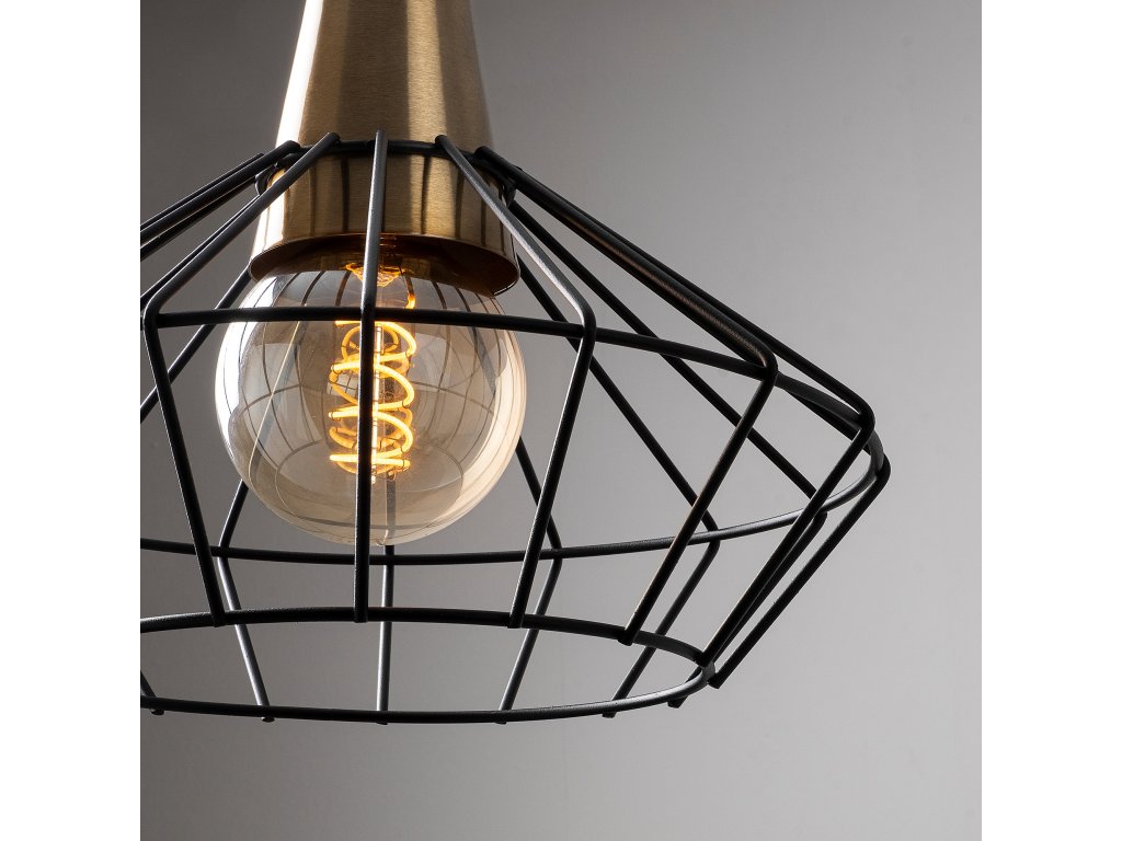 Výškově variabilní lustr WIRE je černý se zlatou barvou na objímce a drátěným stínítkem.