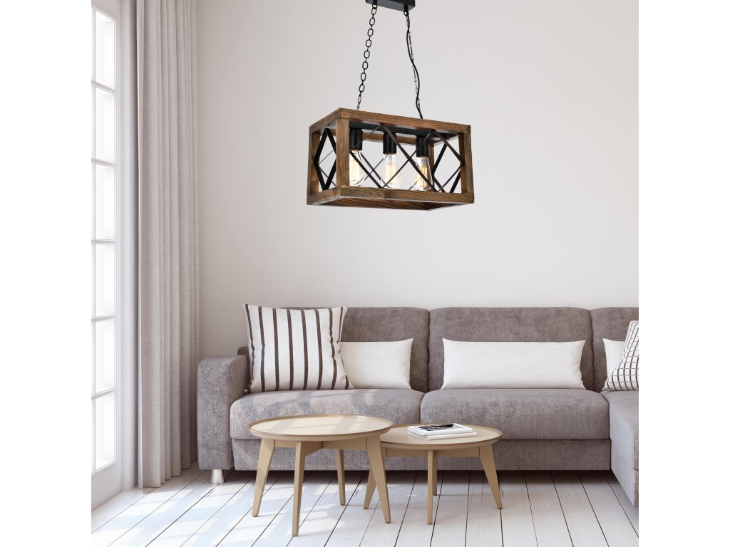 Lustr ZIKZAK 3 RUSTIK je propojením rustikálního i cik-cak stylu, kdy jsou žárovky skryté v kleci pověšené na řetězu pod stropem.