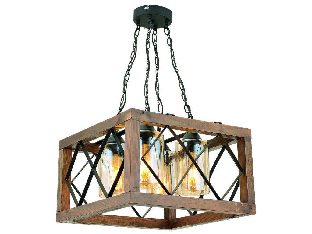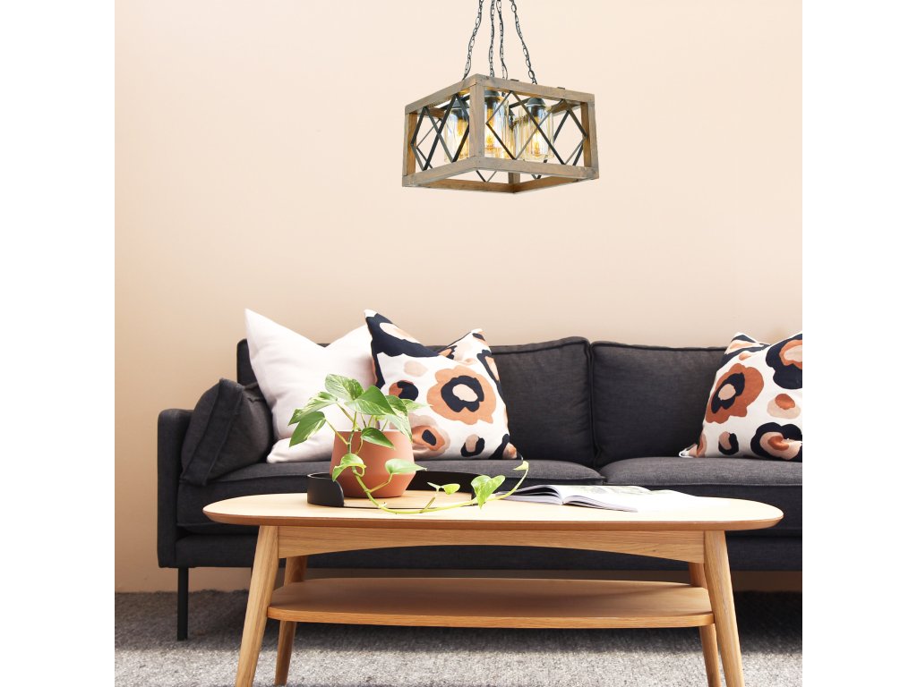 Lustr ZIKZAK 4 KARE má čtyři objímky skryté v kleci z dřevěného rámu dekoru ořech s kovovým řídkým výpletem v černé barvě.