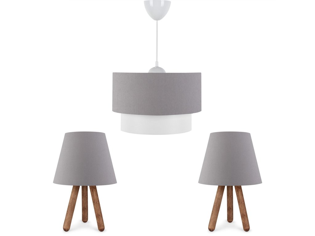 Stolní lampy s šedým kloboukem na dřevěných trojnožkách doplněné o závěsný lustr.