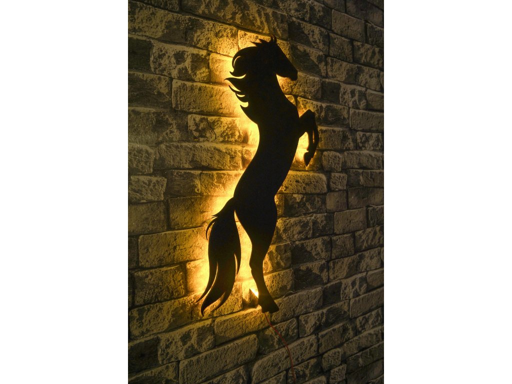 Z kvalitních MDF desek vyrobená nástěnná dekorace ve tvaru koně je vylepšena o žluté LED osvětlení a může být skvělým doplňkem do jakékoliv místnosti.