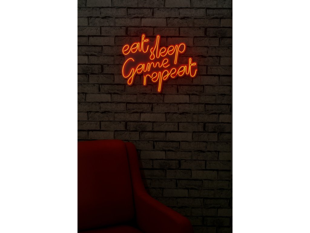 Nápis EAT SLEEP GAME REPEAT je efektivně podsvícený červeným LED světlem dodá každému interiéru připomenutí, že se život opakuje z jídla, spánku a hry.