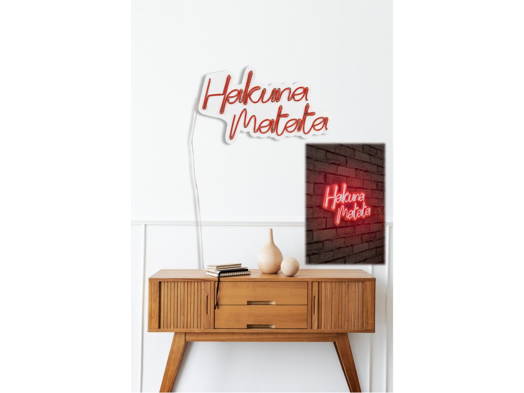 Silueta dvou svahilských slov je efektivně podsvícená červeným LED světlem a dodá každému interiéru pozitivní nádech, neboť „vše je v pohodě“.