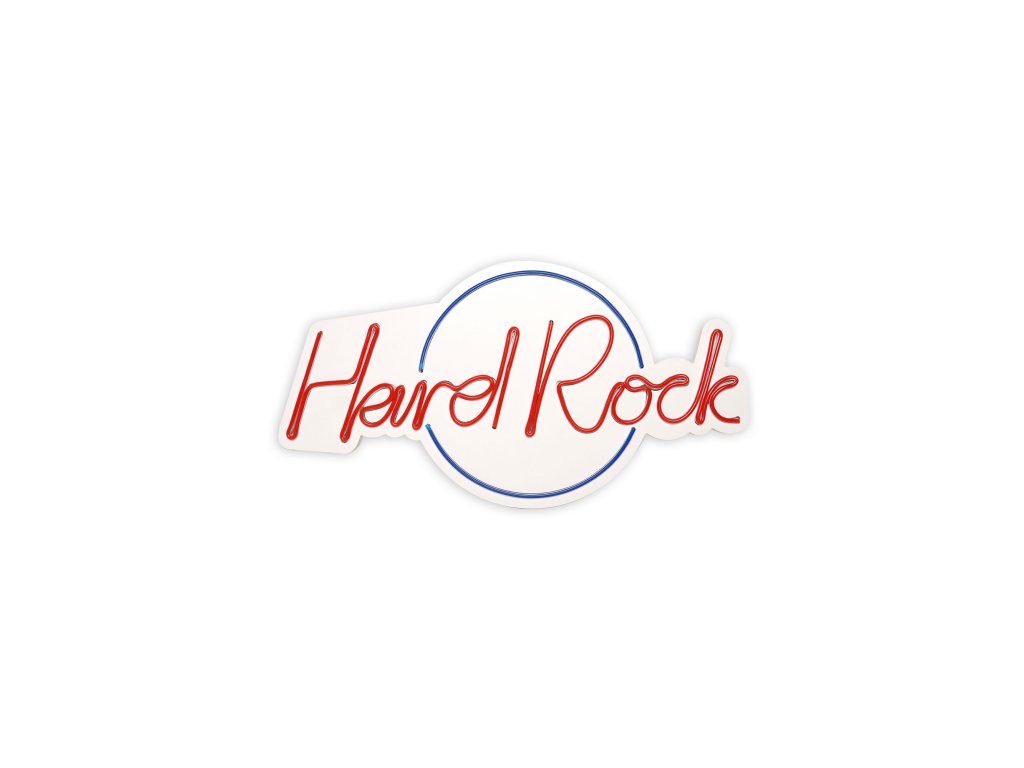Červené dekorativní LED osvětlení s modrým kruhem je tvořeno anglickým nápisem HARD ROCK, který vyjadřuje jistý hudební žánr.