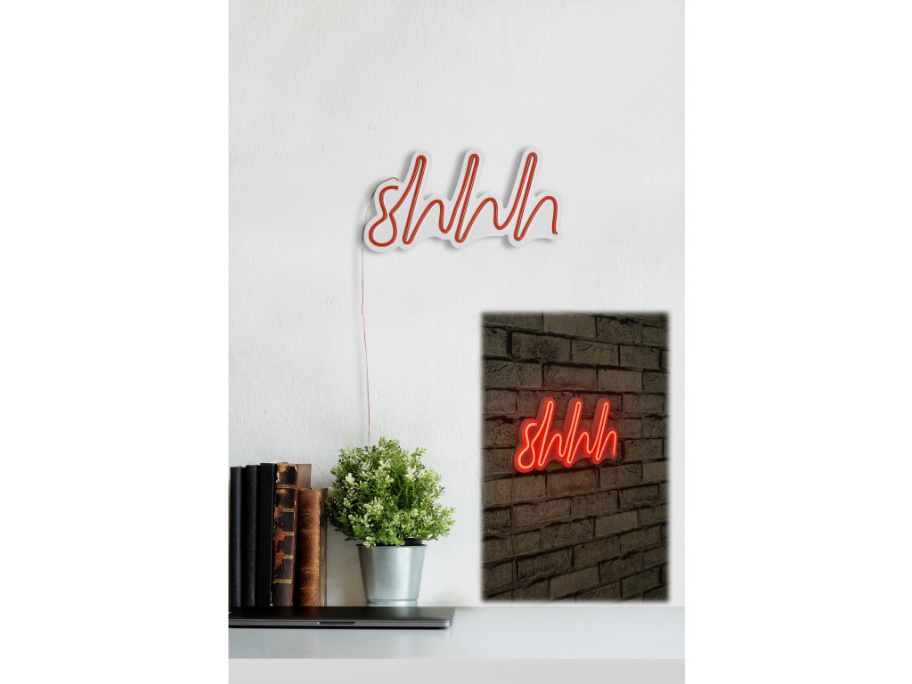 Červené dekorativní LED osvětlení je tvořeno anglickým nápisem SHHH, který vyjadřuje české pšššt.
