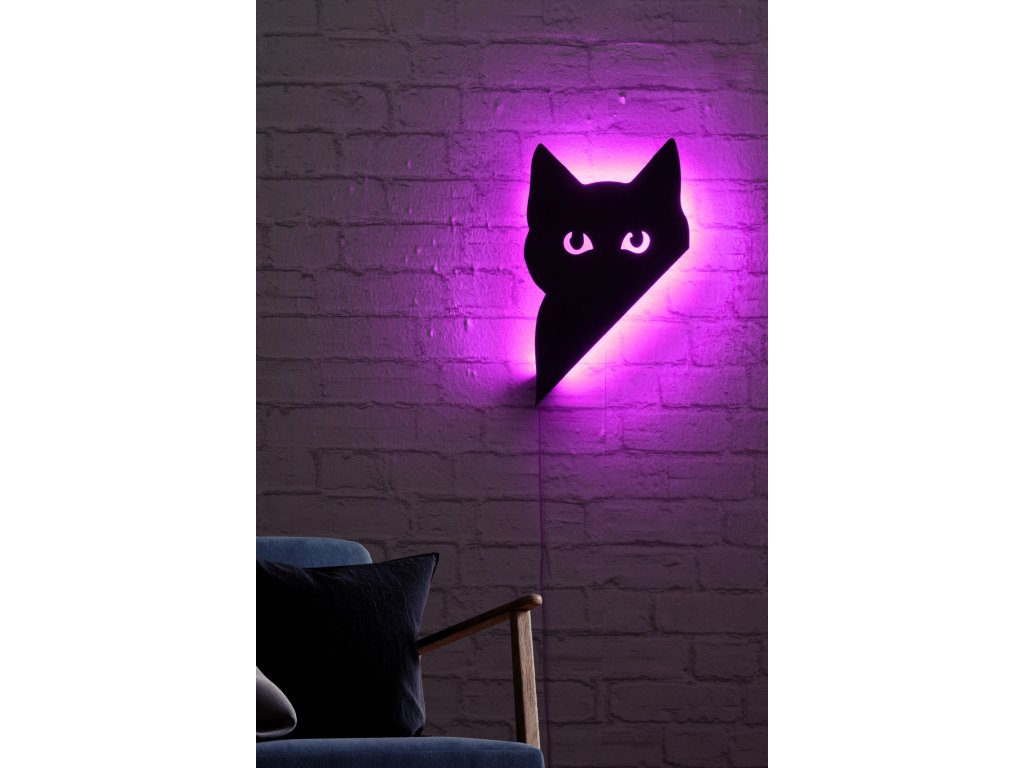 Z kvalitní MDF desky vyrobená 2D nástěnná dekorace ve tvaru kočky jen částečně viditelné je vylepšena o LED fialové osvětlení a může být skvělým doplňkem do jakéhokoliv interiéru.