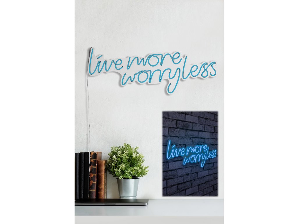 LED dekorativní nápis LIVE MORE WORYLESS v modrém provedení.