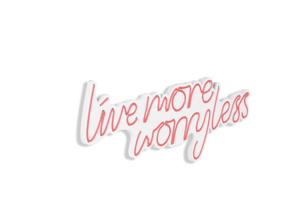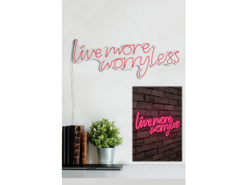 LED dekorativní nápis LIVE MORE WORRYLESS v růžovém provedení.